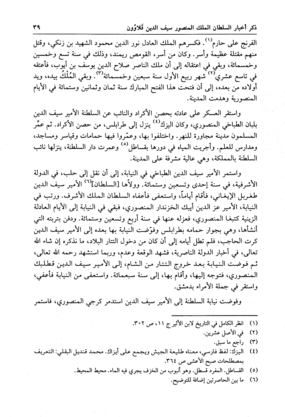 واستمر الأمير سيف الدين الطباخي في النيابة ، إلى أن نقل إلى حلب ، في الدولة الأشرفية ، في سنة إحدى وتسعين وستمائة . وولاها السلطان الأمير سيف الدين طغريل الإيغاني ، فأقام أياماً ، واستعفى فأعفاه السلطان الملك الأشرف . ورتب في النيابة ، الأمير عز الدين أيبك الخزندار المنصوري ، فبقي في النيابة إلى الأيام العادلية الزينية كتبغا المنصوري ، فعزل عنها في سنة أربع وتسعين وستمائة . ودفن بتربته التي أنشأها ، وهي بجوار حمامه بطرابلس وفوّضت النيابة بها بعده إلى الأمير سيف الدين كرت الحاجب ، فلم تطل أيامه إلى أن كان من دخول التتار البلاد ، ما نذكره إن شاء الله تعالى ، في أخبار الدولة الناصرية ، فشهد الوقعة وعدم ، وربما استشهد رحمه الله تعالى . ثم فوضت النيابة بعد خروج التتار من الشام ، إلى الأمير سيف الدين قطلبك المنصوري ، فتوجه إليها ، وأقام بها ، إلى سنة سبعمائة . واستعفي من النيابة فأعفي ، واستقر في جملة الأمراء بدمشق . وفوضت نيابة السلطنة إلى الأمير سيف الدين استدمر كرجي المنصوري ، فاستمر