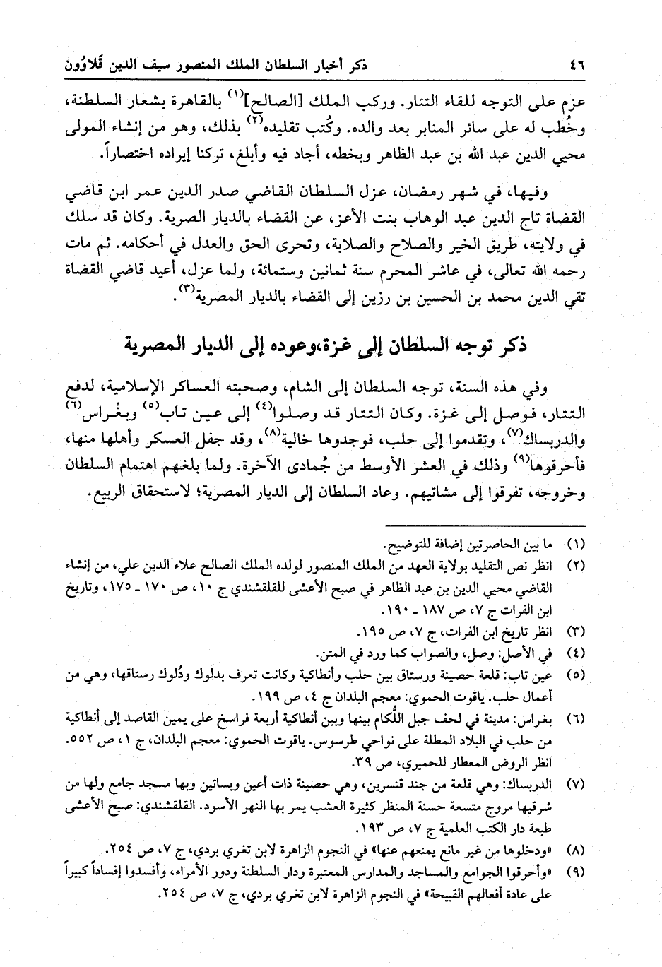 وفي هذه السنة ، توجه السلطان إلى الشام ، وصحبته العساكر الإسلامية ، لدفع التتار ، فوصل إلى غزة . وكان التتار قد وصلوا إلى عين تاب وبغراس والدربساك ، وتقدموا إلى حلب ، فوجدوها خالية ، وقد جفل العسكر وأهلها منها ، فأحرقوها وذلك في العشر الأوسط من جمادى الآخرة . ولما بلغهم اهتمام السلطان وخروجه ، تفرقوا إلى مشاتيهم . وعاد السلطان إلى الديار المصرية ، لاستحقاق الربيع .