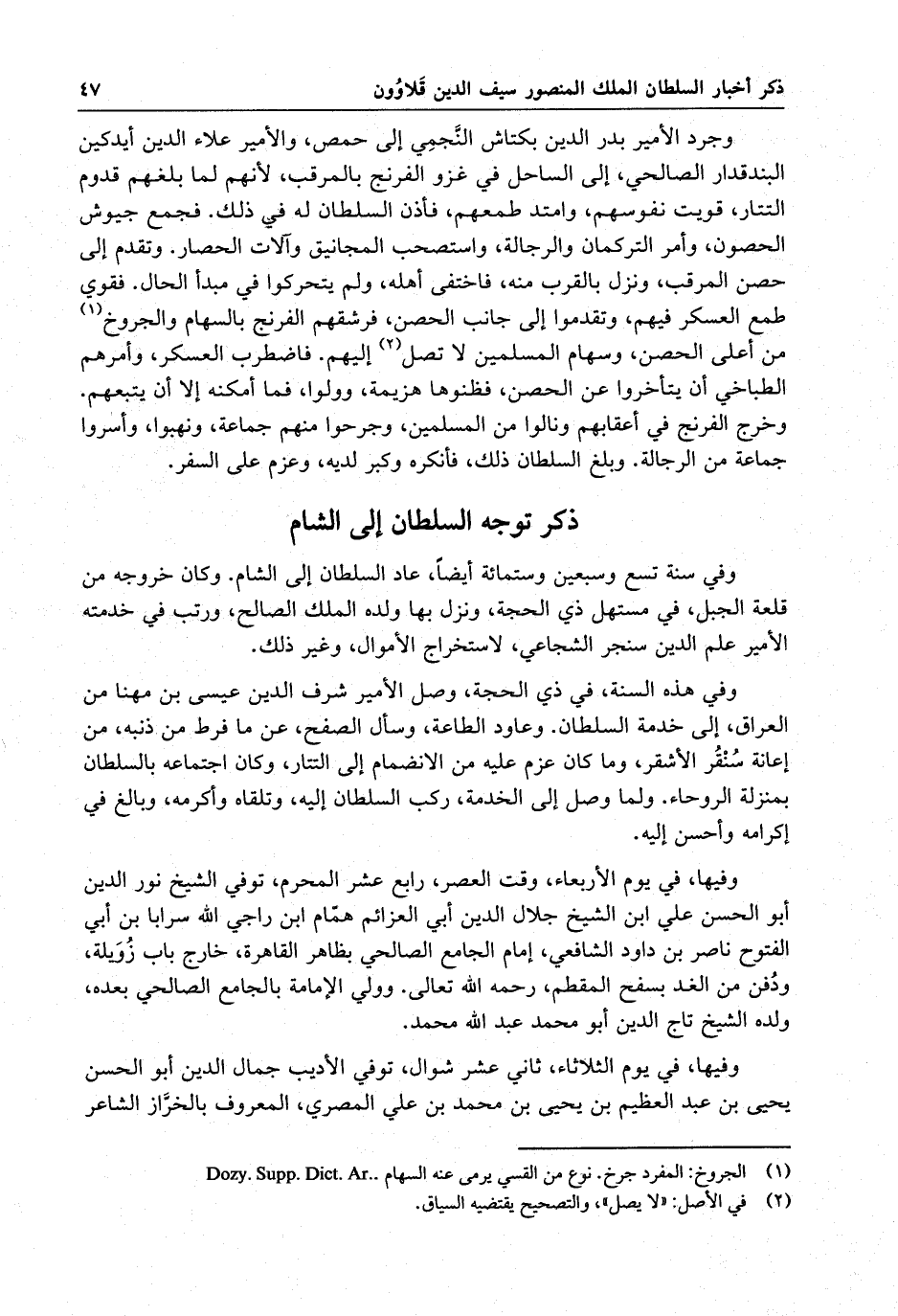 وفي سنة تسع وسبعين وستمائة أيضاً ، عاد السلطان إلى الشام . وكان خروجه من قلعة الجبل ، في مستهل ذي الحجة . ونزل بها ولده الملك الصالح ، ورتب في خدمته الأمير علم الدين سنجر الشجاعي ، لاستخراج الأموال ، وغير ذلك .