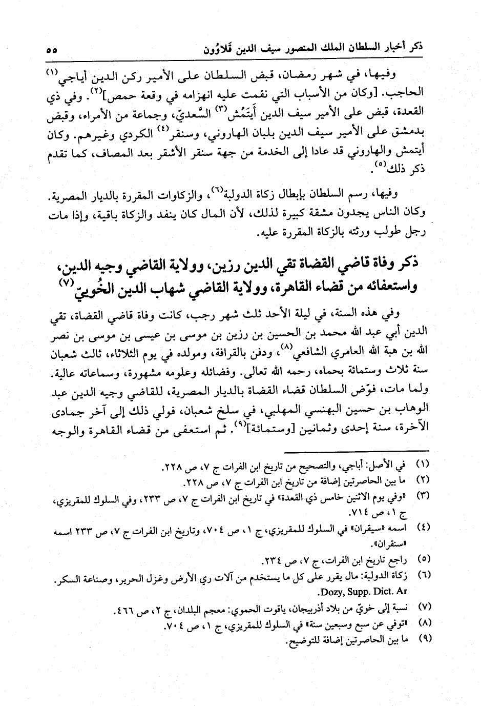 وفي هذه السنة ، في ليلة الأحد ثالث شهر رجب ، كانت وفاة قاضي القضاة ، تقي الدين أبي عبد الله محمد بن الحسين بن رزين بن موسى بن عيسى ، ابن موسى بن نصر الله بن هبة الله العامري الشافعي ، ودفن بالقرافة . ومولده في يوم الثلاثاء ، ثالث شعبان سنة ثلاث وستمائة بحماه ، رحمه الله تعالى . وفضائله وعلومه مشهورة ، وسماعاته عالية . ولما مات ، فوّض السلطان قضاء القضاة بالديار المصرية ، للقاضي وجيه الدين عبد الوهاب بن حسين البهنسي المهلبي ، في سلخ شعبان ، فولي ذلك إلى آخر جمادى الآخرة ، سنة إحدى وثمانين وستمائة . ثم استفي من قضاء القاهرة والوجه
