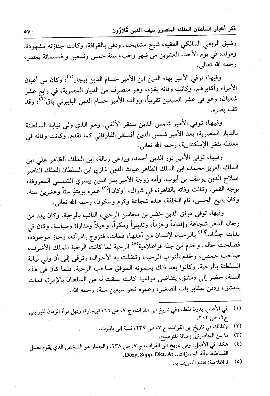 وفيها ، توفي الأمير بهاء الدين ابن الأمير حسام الدين بيجار ، وكان من أعيان الأمراء وأكابرهم . وكان وفاته بغزة ، وهو منصرف إلى الديار المصرية في رابع عشر شعبان ، وهو في عشر السبعين تقريباً ، ووالده الأمير حسام الدين البايبرتي باق ، وقد كف بصره .