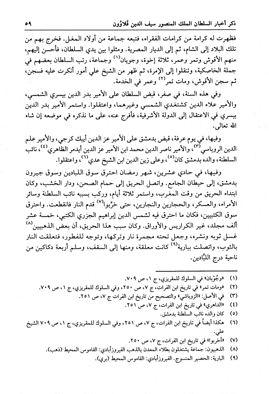 وفيها ، في حادي عشرين شهر رمضان ، احترق سوق اللبادين وسوق جيرون بدمشق ، إلى حيطان الجامع . واتصل الحريق إلى حمام الصحن ، ودار الخشب . وكان ابتداء الحريق من وقت المغرب ، واستمر ثلاثة أيام ، وركب بسببه نائب السلطنة وسائر الأمراء ، والعسكر ، والحجارين والنجارين ، حتى خرّبوا قدام النار فانقطعت . واحترق سوق الكتبيين ، فكان ما احترق فيه لشمس الدين إبراهيم الجزري الكتبي ، خمسة عشر ألف مجلد ، غير الكراريس والأوراق . وكان سبب هذا الحريق ، أن بعض الذهبيين غسل ثوبه ونشره ، وجعل تحته مجمرة نار وتركها ، وتوجه للفطور ، فتعلقت النار بالثوب ، واتصلت ببارية كانت معلقة ، ومنها إلى السقف . وسلم أربعة دكاكين من ناحية درج اللبادين .