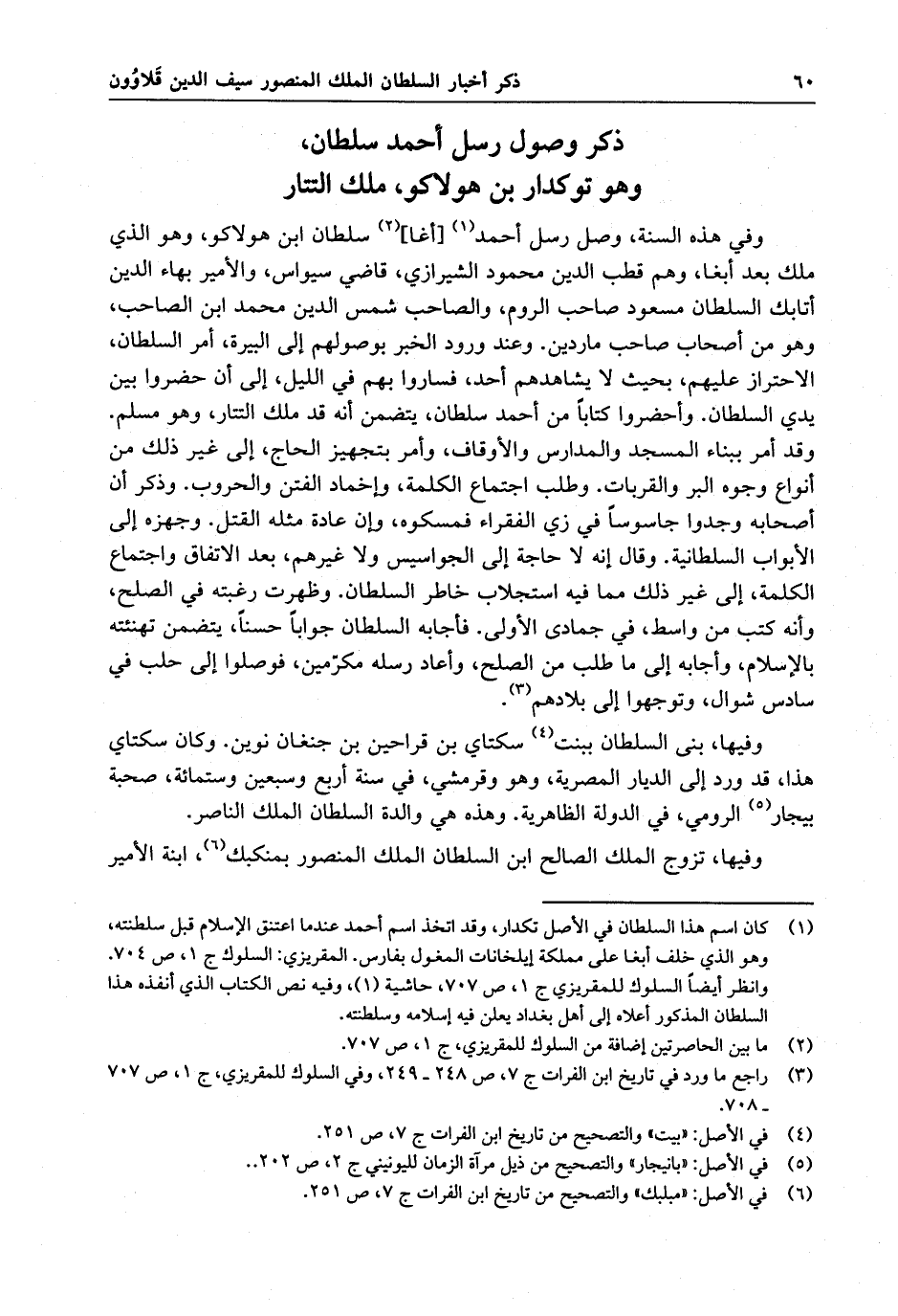 وفي هذه السنة ، وصل رسل أحمد سلطان بن هولاكو ، وهو الذي ملك بعد أبغا ، وهم قطب الدين محمود الشيرازي ، قاضي سيواس ، والأمير بهاء الدين أتابك السلطان مسعود صاحب الروم ، والصاحب شمس الدين محمد ابن الصاحب ، وهو من أصحاب ماردين . وعند ورود الخبر بوصولهم إلى البيرة ، أمر السلطان ، الاحتراز عليهم ، بحيث لا يشاهدهم أحد . فساروا بهم في الليل ، إلى أن حضروا بين يدي السلطان . وأحضروا كتاباً من أحمد سلطان ، يتضمن أنه قد ملك التتار ، وهو مسلم . وقد أمر ببناء المسجد والمدارس والأوقاف ، وأمر بتجهيز الحاج ، إلى غير ذلك من أنواع وجوه البر والقربات . وطلب اجتماع الكلمة ، وإخماد نار الفتن والحروب . وذكر أن أصحابه وجدوا جاسوساً في زي الفقراء فمسكوه ، وإن عادة مثله القتل . وجهزه إلى الأبواب السلطانية . وقال إنه لا حاجة إلى الجواسيس ولا غيرهم ، بعد الاتفاق واجتماع الكلمة ، إلى غير ذلك مما فيه استجلاب خاطر السلطان . وظهرت رغبته في الصلح ، وأنه كتب من واسط ، في جمادى الأولى . فأجابه السلطان جواباً حسناً ، يتضمن تهنئته بالإسلام ، وأجابه إلى ما طلب من الصلح ، وأعاد رسله مكرمين . فوصلوا إلى حلب في سادس شوال ، وتوجهوا إلى بلادهم . وفيها ، بنى السلطان ببنت سكتاي بن قراحين بن جنغان نوين . وكان سكتاي هذا ، قد ورد إلى الديار المصرية ، هو وقرمش ، في سنة أربع وسبعين وستمائة ، صحبة بيجار الرومي الظاهرية . وهذه هي والدة السلطان الملك الناصر .