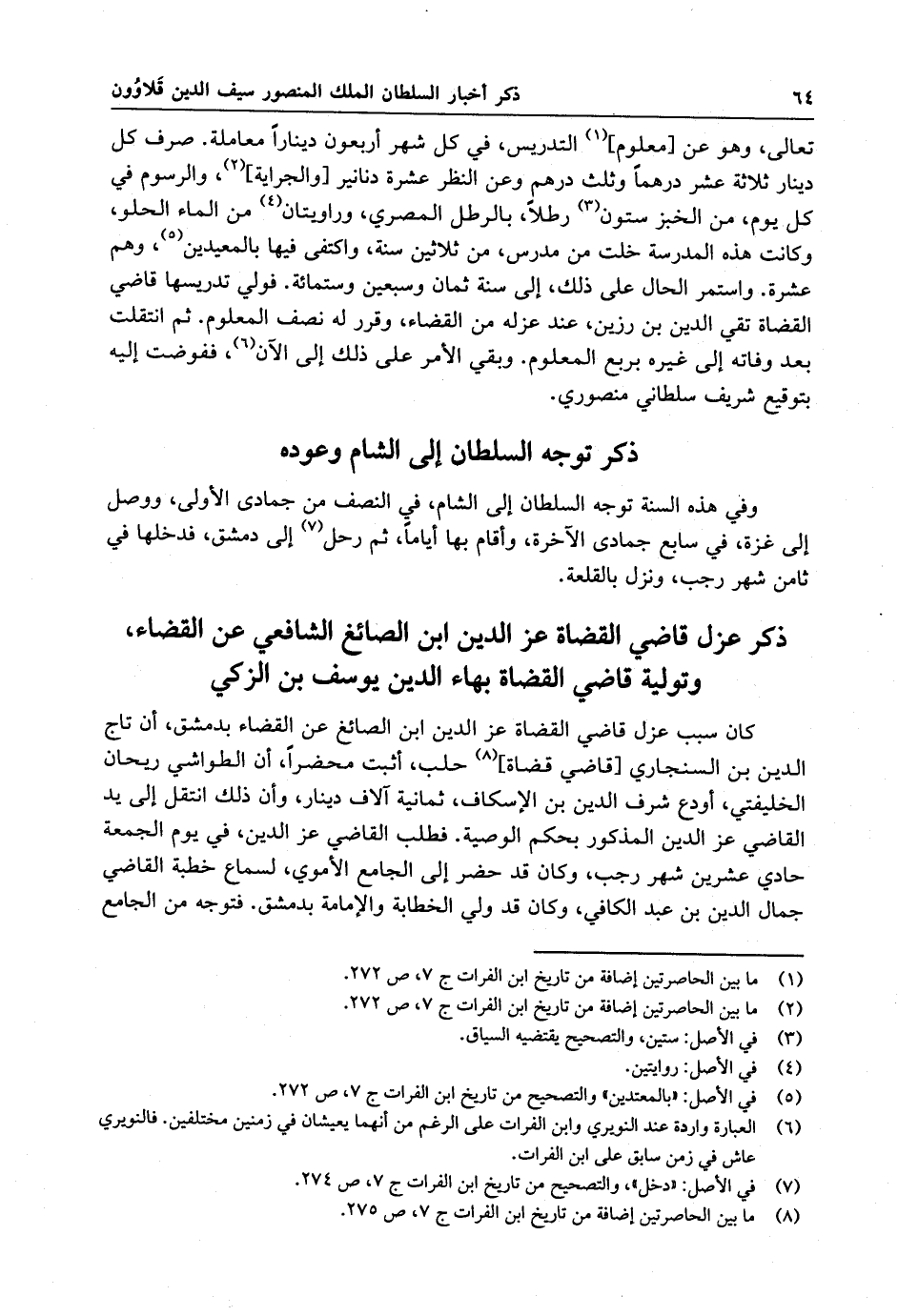 تعالى ، وهو من معلوم التدريس ، في كل شهر أربعون ديناراً معاملة ، صرف كل دينار ثلاثة عشر درهماً وثلث درهم وعن النظر عشرة دنانير والجراية ، والرسوم في كل يوم ، من الخبز ستون رطل ، بالرطل المصري ، وراويتان من الماء الحلو . وكانت هذه المدرسة ، خلت من مدرس ، من ثلاثين سنة ، واكتفي فيها بالمعيدين ، وهم عشرة . واستمر الحال على ذلك ، إلى سنة ثمان وسبعين وستمائة . فولي تدريسها قاضي القضاة تقي الدين بن رزين ، عند عزله من القضاء . وقرر له نصف المعلوم . ثم انتقلت بعد وفاته إلى غيره بربع المعلوم ، وبقي الأمر على ذلك إلى الان ، ففوضت إليه بتوقيع شريف سلطاني منصوري .