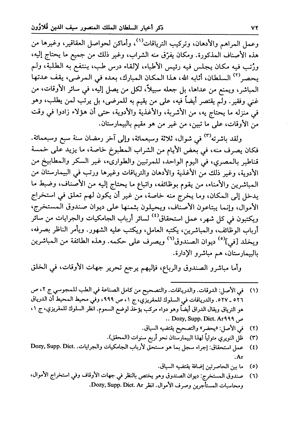ولقد باشرته في شوال سنة ثلاث وسبعمائة ، والى آخر رمضان سنة سبع وسبعمائة . فكان يصرف منه ، في بعض الأيام ، من الشراب المطبوخ خاصة ، ما يزيد علي خمسة قناطير بالمصري ، في اليوم الواحد ، للمرتبين والطوارئ ، غير السكر والمطابيخ من الأدوية وغير ذلك من الأغذية والأدهان والترياقات وغيرها ورتب في البيمارستان من المباشرين والأمناء ، من يقوم بوظائفه ، واتباع ما يحتاج إليه من الأصناف ، وضبط ما يدخل إلى المكان ، وما يخرج منه خاصة ، من غير أن يكون لهم تعلق في استخراج الأموال . وإنما يبتاعون الأصناف ، ويحيلون بثمنها على ديوان صندوق المستخرج ، ويكتبون في كل شهر ، عمل استحقاق لسائر أرباب الجامكيات والجرايات من سائر أرباب الوظائف والمباشرين ، يكتبه العامل ، ويكتب عليه الشهور . ويأمر الناظر بصرفه ، ويخلد في ديوان الصندوق ويصرف على حكمه . وهذه الطائفة من المباشرين بالبيمارستان ، هم مباشرو الإدارة .