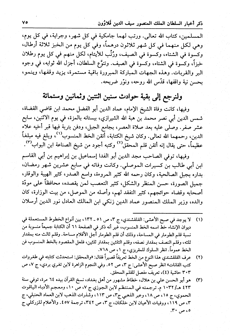 وفيها ، كانت وفاة الشيخ الإمام ، عماد الدين أبو الفضل محمد ابن قاضي القضاة ، شمس الدين أبي نصر محمد بن هبة الله الشيرازي ، ببستانه بالمزه ، في يوم الإثنين ، سابع عشر صفر . وصلي عليه بعد صلاة العصر ، بجامع الجبل ، ودفن بتربة فيها قبر أخيه علاء الدين ، رحمهما الله تعالى . وكان شيخ الكتابة ، أتقن الخط المنسوب ، وبلغ فيه مبلغاً عظيماً ، حتى يقال إنه أتقن قلم المحقق ، وكتبه أجود من شيخ الصناعة ابن البواب .