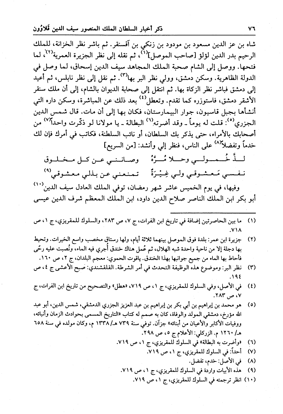 شاه بن عز الدين مسعود بن مودود بن زنكي بن آقسنقر . ثم باشر نظر الخزانة ، للملك الرحيم بدر الدين لؤلؤ صاحب الموصل ثم نقله إلى نظر الجزيرة العمرية ، لما فتحها . ووصل إلى الشام صحبة الملك المجاهد سيف الدين إسحاق ، لما وصل في الدولة الظاهرية . وسكن دمشق ، وولي نظر البر بها . ثم نقل إلى نظر طرابلس ، ثم أعيد إلى دمشق فباشر نظر الزكاة بها . ثم انتقل إلى صحابة الديوان بالشام ، إلى أن ملك سنقر الأشقر دمشق ، فاستوزره كما تقدم . وتعطل بعد ذلك عن المباشرة ، وسكن داره التي أنشأها بجبل قاسيون ، جوار البيمارستان ، فكان بها إلى أن مات . قال شمس الدين الجزري : قلت له يوماً - وقد أضرته البطالة - يا مولانا لو ذكرت واحداً من أصحابك الأمراء ، حتى يذكر بك السلطان ، أو نائب السلطنة ، فكاتب في أمرك فإن لك خدماً وتفضلاً على الناس ، فنظر إلي وأنشد : لذّ خمولي وحلا مره . . . وصانني عن كل مخلوق