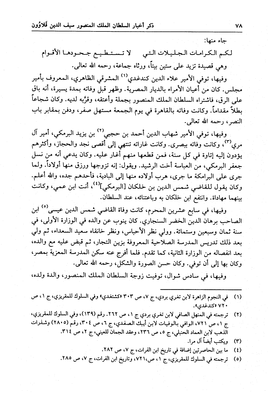 وفيها ، توفي الأمير علاء الدين كندغدي المشرقي الظاهري ، المعروف بأمير مجلس . كان من أعيان الأمراء بالديار المصرية . وظهر قبل وفاته بمدة يسيرة ، أنه باق على الرق . فاشتراه السلطان الملك المنصور بجملة وأعتقه ، وقربه لديه . وكان شجاعاً بطلاً مقداماً . وكانت وفاته بالقاهرة ، في يوم الجمعة مستهل صفر . ودفن بمقابر باب النصر ، رحمه الله تعالى .