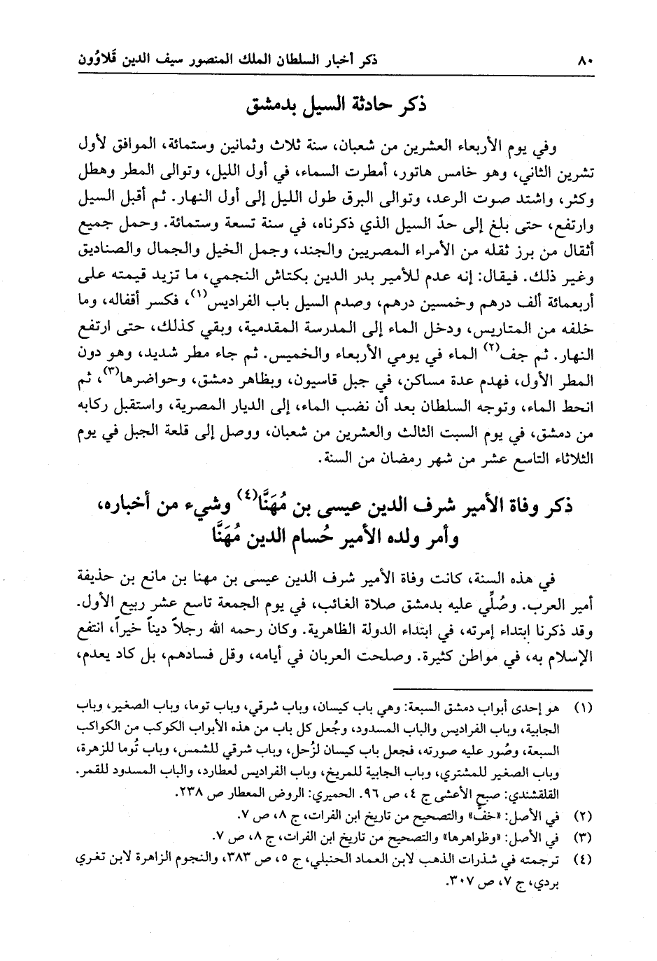 وفي يوم الأربعاء ، العشرين من شعبان ، سنة ثلاث وثمانين وستمائة ، الموافق الأول من تشرين الثاني ، وهو خامس هاتور ، أمطرت السماء ، في أول الليل ، وتوالى المطر وهطل وكثر ، واشتد صوت الرعد ، وتوالى البرق طول الليل إلى أول النهار . ثم أقبل السيل وارتفع ، حتى بلغ إلى حد السيل الذي ذكرناه في سنة تسعة وستين وستمائة . وحمل جميع أثقال من برز ثقله من الأمراء المصريين والجند ، وحمل الخيل والجمال والصناديق وغير ذلك . فيقال إنه عدم للأمير بدر الدين بكتاش النجمي ، ما تزيد قيمته على أربعمائة ألف درهم وخمسين درهم ، وصدم السيل باب الفراديس ، فكسر أقفاله ، وما خلفه من المتاريس ، ودخل الماء إلى المدرسة المقدمية ، وبقي كذلك حتى ارتفع النهار . ثم جف الماء في يومي الأربعاء والخميس . ثم جاء مطر شديد ، وهو دون المطر الأول ، فهدم عدة مساكن ، في جبل قاسيون ، وبظاهر دمشق وحواضرها . ثم انحط الماء ، وتوجه السلطان بعد أن نضب الماء ، إلى الديار المصرية . واستقل ركابه من دمشق ، في يوم السبت الثالث والعشرين من شعبان ، ووصل إلى قلعة الجبل في يوم الثلاثاء التاسع عشر من شهر رمضان من السنة .