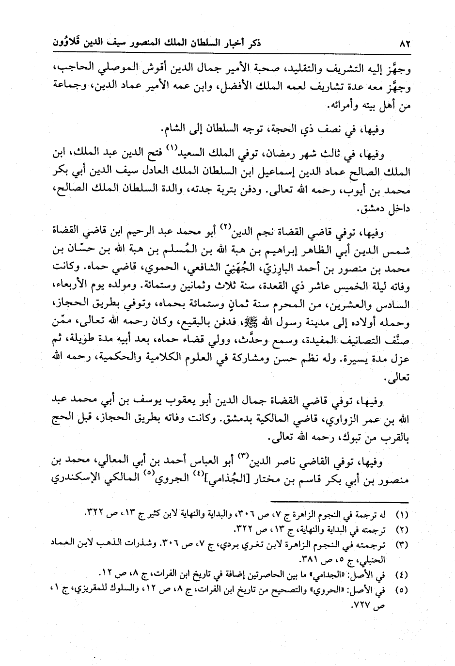 وفيها ، توفي قاضي القضاة نجم الدين أبو محمد عبد الرحيم ابن قاضي القضاة شمس الدين أبو الظاهر إبراهيم بن هبة الله بن المسلم بن هبة الله بن حسان بن محمد بن منصور بن أحمد البارزي ، الجهني الشافعي ، الحموي ، قاضي حماه . وكانت وفاته ليلة الخميس عاشر ذي القعدة ، سنة ثلاث وثمانين وستمائة . ومولده يوم الأربعاء ، السادس والعشرين من المحرم سنة ثمان وستمائة بحماه . وتوفي بطريق الحجاز ، وحمله أولاده إلى مدينة رسول الله ( صلى الله عليه وسلم ) ، فدفن بالبقيع . وكان رحمه الله تعالى ، ممن صنّف التصانيف المفيدة ، وسمع وحدّث ، وولي قضاء حماه ، بعد أبيه مدة طويلة . ثم هزل مدة يسيرة . وله نظم حسن ومشاركة في العلوم الكلامية والحكمية ، رحمه الله تعالى .