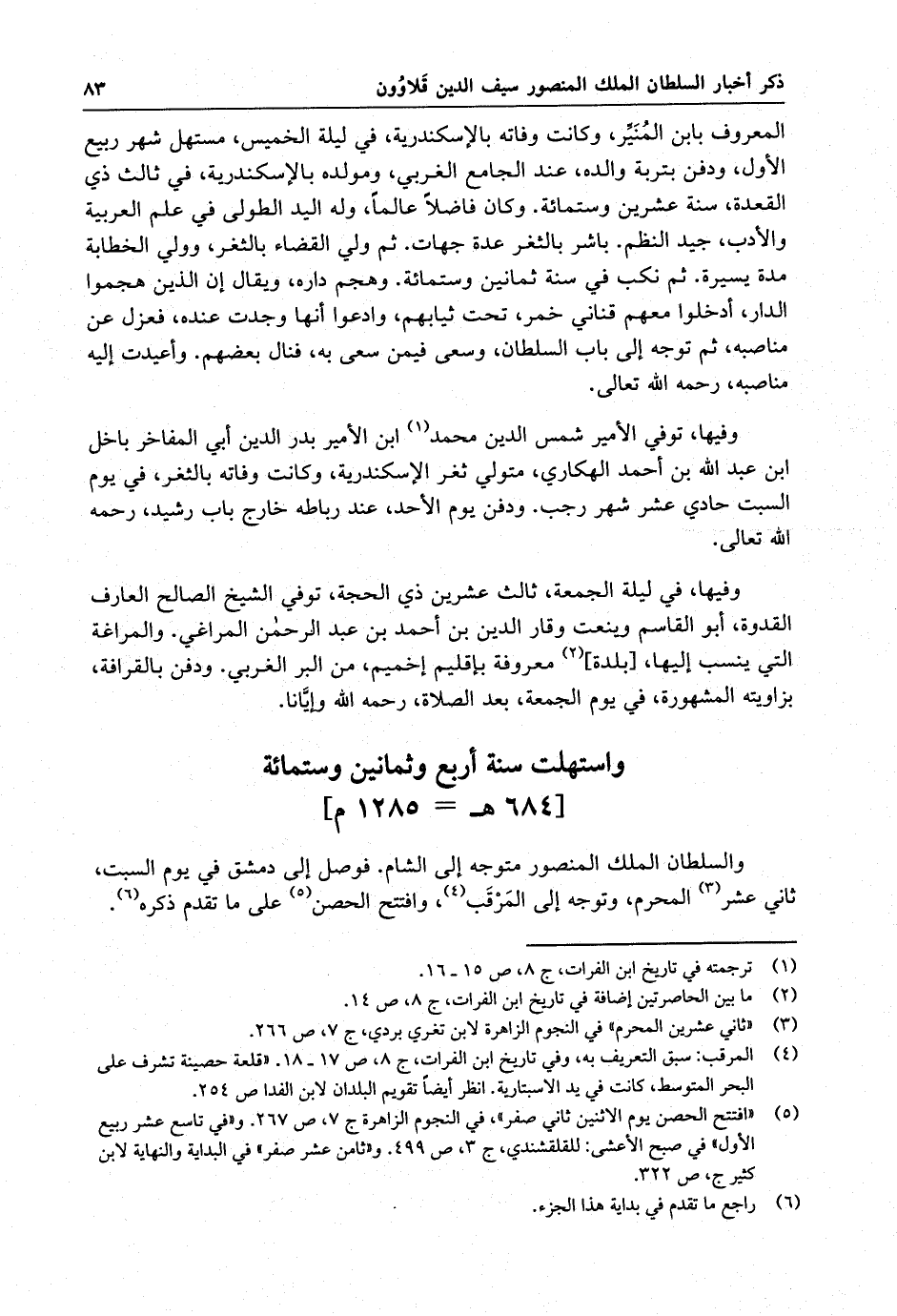 واستهلت سنة أربع وثمانين وستمائة [ 684 ه 1285 م ]