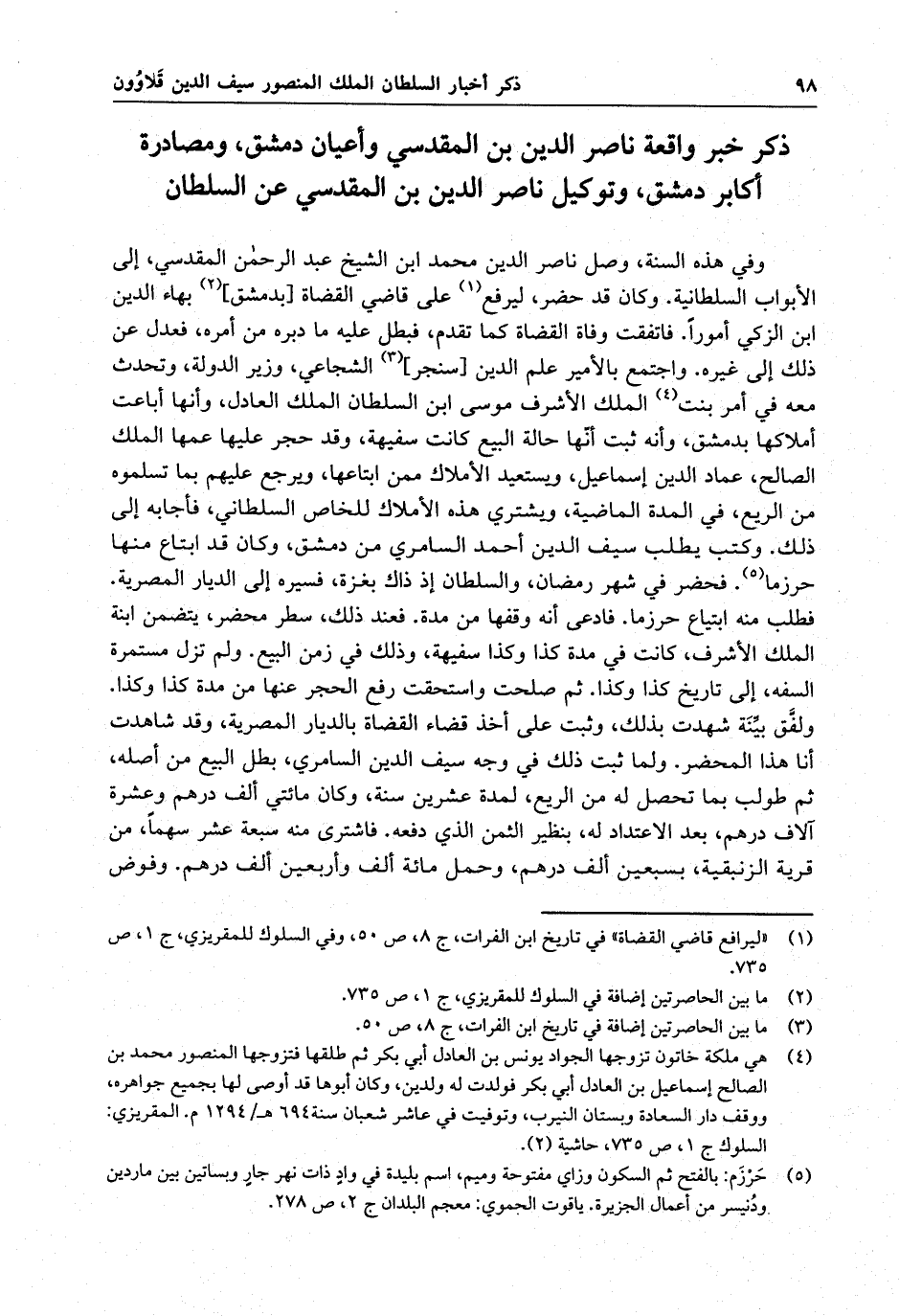 وفي هذه السنة ، وصل ناصر الدين محمد ابن الشيخ عبد الرحمن المقدسي ، إلى الأبواب السلطانية . وكان قد حضر ، ليرفع على قاضي القضاة بهاء الدين ابن الزكي أموراً . فاتفقت وفاة قاضي القضاة كما تقدم ، فبطل عليه ما دبره من أمره ، فعدل عن ذلك إلى غيره . واجتمع بالأمير علم الدين سنجر الشجاعي ، وزير الدولة ، وتحدث معه في أمر بنت الملك الأشرف موسى ابن السلطان الملك العادل ، وأنها أباعت أملاكها بدمشق ، وأنه ثبت أنها حالة البيع كانت سفيهة ، وقد حجر عليها عمها الملك الصالح ، عماد الدين اسماعيل ، ويستعيد الأملاك ممن ابتاعها ، ويرجع عليهم بما تسلموه من الريع ، في المدة الماضية ، ويشتري هذه الأملاك للخاص السلطاني ، فأجابه إلى ذلك . وكتب يطلب سيف الدين أحمد السامري من دمشق ، وكان قد ابتاع منها حرزما . فحضر في شهر رمضان ، والسلطان إذ ذاك بغزة ، فسيره إلى الديار المصرية . فطلب منه ابتياع حرزما ، فادعى أنه وقفها من مدة . فعند ذلك ، سطر محضر ، يتضمن ابنة الملك الأشرف ، كانت في مدة كذا وكذا سفيهة ، وذلك في زمن البيع ، ولم تزل مستمرة السفه ، إلى تاريخ كذا وكذا . ثم صلحت واستحقت رفع الحجر عنها من مدة كذا وكذا . ولفّق بيّنة شهدت بذلك ، وثبت على أخذ قضاء القضاة بالديار المصرية ، وقد شاهدت أنا هذا المحضر . ولما ثبت ذلك في وجه سيف الدين السامري ، بطل البيع من أصله . ثم طولب بما تحصل له من الريع ، لمدة عشرين سنة ، وكان مائتي ألف درهم وعشرة آلاف درهم ، بعد الاعتداد له ، بنظير الثمن الذي دفعه . فاشترى منه سبعة عشر سهماً ، من قرية الزنبقية ، بسبعين ألف درهم ، وحمل مائة ألف وأربعين ألف درهم . وفوض