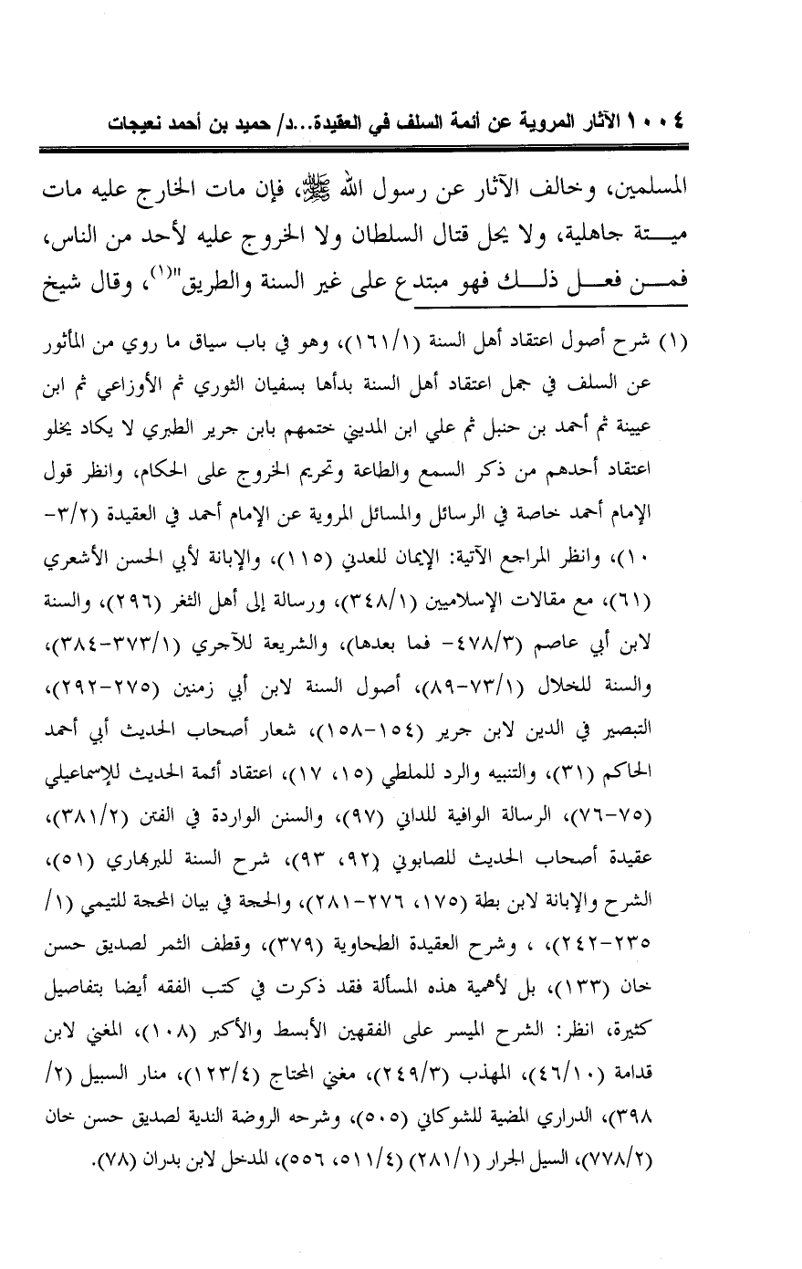 (¬١) شرح أصول اعتقاد أهل السنة (١/ ١٦١)، وهو في باب سياق ما روي من المأثور عن السلف في جمل اعتقاد أهل السنة بدأها بسفيان الثوري ثم الأوزاعي ثم ابن عيينة ثم أحمد بن حنبل ثم علي ابن المديني ختمهم بابن جرير الطبري لا يكاد يخلو اعتقاد أحدهم من ذكر السمع والطاعة وتحريم الخروج على الحكام، وانظر قول الإمام أحمد خاصة في الرسائل والمسائل المروية عن الإمام أحمد في العقيدة (٢/ ٣ - ١٠)، وانظر المراجع الآتية: الإيمان للعدني (١١٥)، والإبانة لأبي الحسن الأشعري (٦١)، مع مقالات الإسلاميين (١/ ٣٤٨)، ورسالة إلى أهل الثغر (٢٩٦)، والسنة لابن أبي عاصم (٣/ ٤٧٨ - فما بعدها)، والشريعة للآجري (١/ ٣٧٣ - ٣٨٤)، والسنة للخلال (١/ ٧٣ - ٨٩)، أصول السنة لابن أبي زمنين (٢٧٥ - ٢٩٢)، التبصير في الدين لابن جرير (١٥٤ - ١٥٨)، شعار أصحاب الحديث أبي أحمد الحاكم (٣١)، والتنبيه والرد للملطي (١٥، ١٧)، اعتقاد أئمة الحديث للإسماعيلي (٧٥ - ٧٦)، الرسالة الوافية للداني (٩٧)، والسنن الواردة في الفتن (٢/ ٣٨١)، عقيدة أصحاب الحديث للصابوني (٩٢، ٩٣)، شرح السنة للبربهاري (٥١)، الشرح والإبانة لابن بطة (١٧٥، ٢٧٦ - ٢٨١)، والحجة في بيان المحجة للتيمي (١/ ٢٣٥ - ٢٤٢)، ، وشرح العقيدة الطحاوية (٣٧٩)، وقطف الثمر لصديق حسن خان (١٣٣)، بل لأهمية هذه المسألة فقد ذكرت في كتب الفقه أيضًا بتفاصيل كثيرة، انظر: الشرح الميسر على الفقهين الأبسط والأكبر (١٠٨)، المغني لابن قدامة (١٠/ ٤٦)، المهذب (٣/ ٢٤٩)، مغني المحتاج (٤/ ١٢٣)، منار السبيل (٢/ ٣٩٨)، الدراري المضية للشوكاني (٥٠٥)، وشرحه الروضة الندية لصديق حسن خان (٢/ ٧٧٨)، السيل الجرار (١/ ٢٨١) (٤/ ٥١١، ٥٥٦)، المدخل لابن بدران (٧٨).
