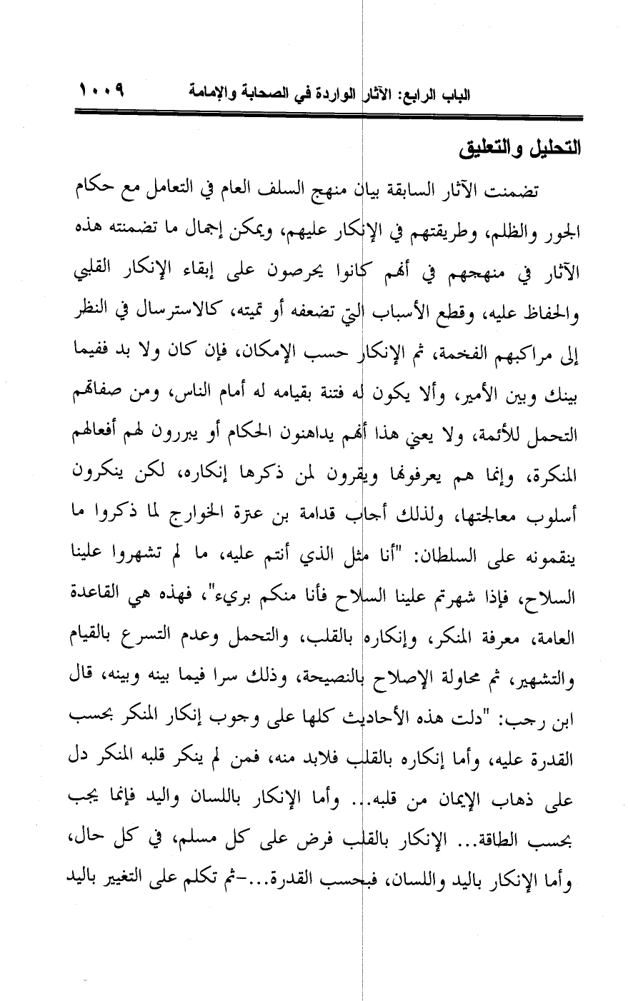 تضمنت الآثار السابقة بيان منهج السلف العام في التعامل مع حكام الجور والظلم، وطريقتهم في الإنكار عليهم، ويمكن إجمال ما تضمنته هذه الآثار في منهجهم في أنهم كانوا يحرصون على إبقاء الإنكار القلبي والحفاظ عليه، وقطع الأسباب التي تضعفه أو تميته، كالاسترسال في النظر إلى مراكبهم الفخمة، ثم الإنكار حسب الإمكان، فإن كان ولا بد ففيما بينك وبين الأمير، وألا يكون له فتنة بقيامه له أمام الناس، ومن صفاتهم التحمل للأئمة، ولا يعني هذا أنهم يداهنون الحكام أو يبررون لهم أفعالهم النكرة، وإنما هم يعرفونها ويقرون لمن ذكرها إنكاره، لكن ينكرون أسلوب معالجتها، ولذلك أجاب قدامة بن عترة الخوارج لما ذكروا ما ينقمونه على السلطان: "أنا مثل الذي أنتم عليه، ما لم تشهروا علينا السلاح، فإذا شهرتم علينا السلاح فأنا منكم بريء"، فهذه هي القاعدة العامة، معرفة المنكر، وإنكاره بالقلب، والتحمل وعدم التسرع بالقيام والتشهير، ثم محاولة الإصلاح بالنصيحة، وذلك سرا فيما بينه وبينه، قال ابن رجب: "دلت هذه الأحاديث كلها على وجوب إنكار المنكر بحسب القدرة عليه، وأما إنكاره بالقلب فلا بد منه، فمن لم ينكر قلبه المنكر دل على ذهاب الإيمان من قلبه. . . وأما الإنكار باللسان واليد فإنما يجب بحسب الطاقة. . . الإنكار بالقلب فرض على كل مسلم، في كل حال، وأما الإنكار باليد واللسان، فبحسب القدرة. . . - ثم تكلم على التغيير باليد