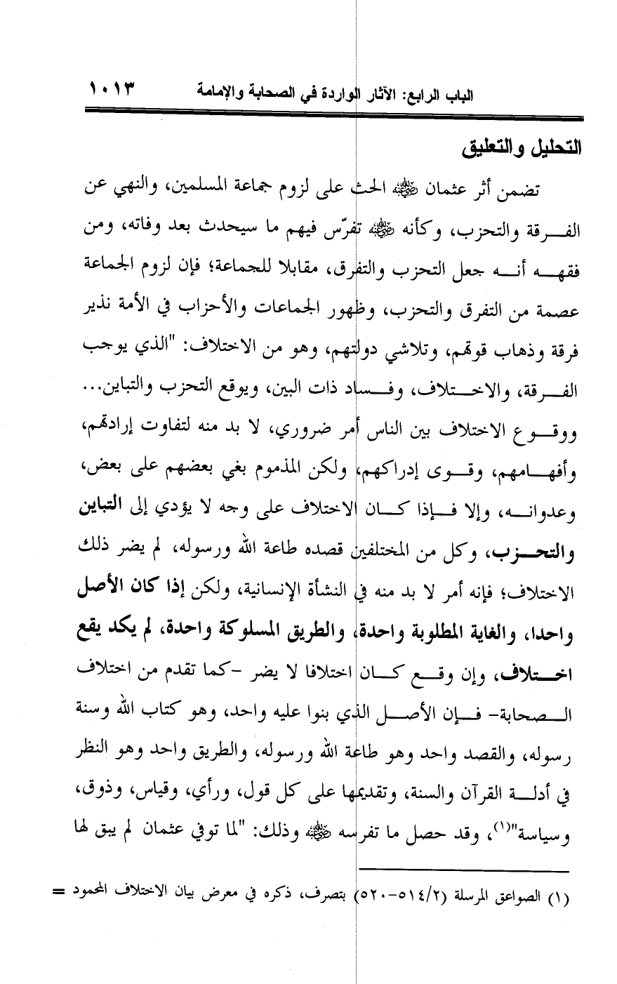 تضمن أثر عثمان -رضي اللَّه عنه- الحث على لزوم جماعة المسلمين، والنهي عن الفرقة والتحزب، وكأنه -رضي اللَّه عنه- تفرّس فيهم ما سيحدث بعد وفاته، ومن فقهه أنه جعل التحزب والتفرق، مقابلا للجماعة؛ فإن لزوم الجماعة عصمة من التفرق والتحزب، وظهور الجماعات والأحزاب في الأمة نذير فرقة وذهاب قوتهم، وتلاشي دولتهم، وهو من الاختلاف: "الذي يوجب الفرقة، والاختلاف، وفساد ذات البين، ويوقع التحزب والتباين. . . ووقوع الاختلاف بين الناس أمر ضروري، لا بد منه لتفاوت إرادتهم، وأفهامهم، وقوى إدراكهم، ولكن المذموم بغي بعضهم على بعض، وعدوانه، وإلا فإذا كان الاختلاف على وجه لا يؤدي إلى التباين والتحزب، وكل من المختلفين قصده طاعة اللَّه ورسوله، لم يضر ذلك الاختلاف؛ فإنه أمر لا بد منه في النشأة الانسانية، ولكن إذا كان الأصل واحدا، والغاية المطلوبة واحدة، والطريق المسلوكة واحدة، لم يكد يقع اختلاف، وإن وقع كان اختلافا لا يضر -كما تقدم من اختلاف الصحابة- فإن الأصل الذي بنوا عليه واحد، وهو كتاب اللَّه وسنة رسوله، والقصد واحد وهو طاعة اللَّه ورسوله، والطريق واحد وهو النظر في أدلة القرآن والسنة، وتقديمها على كل قول، ورأي، وقياس، وذوق، وسياسة" (¬١)، وقد حصل ما تفرسه -رضي اللَّه عنه- وذلك: "لما توفي عثمان لم يبق لها