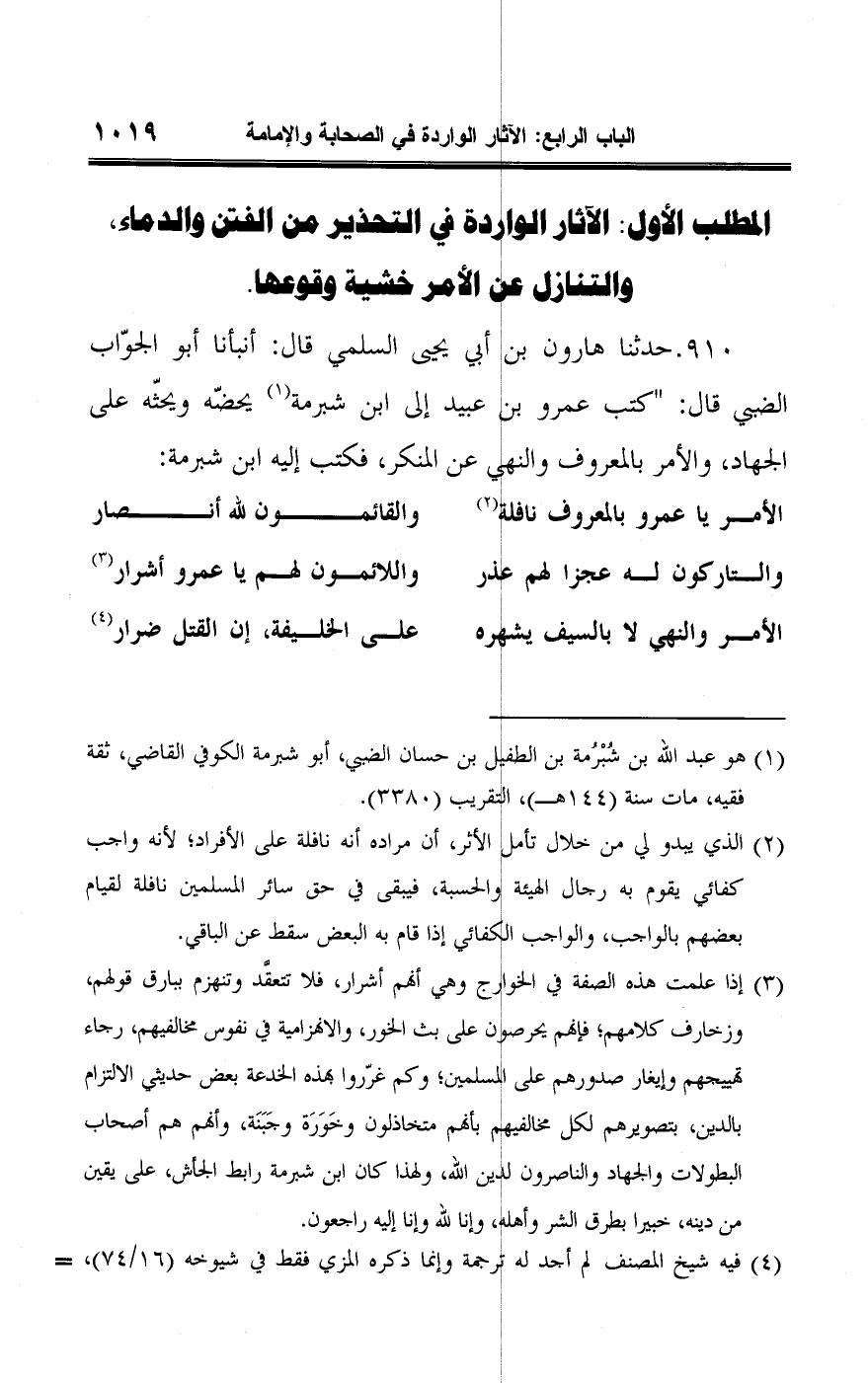 ٩١٠ - حدثنا هارون بن أبي يحيى السلمي قال: أنبأنا أبو الجوّاب الضبي قال: "كتب عمرو بما عبيد إلى ابن شبرمة (¬١) يحضّه ويحثّه على الجهاد، والأمر بالمعروف والنهي عن المنكر، فكتب إليه ابن شبرمة: