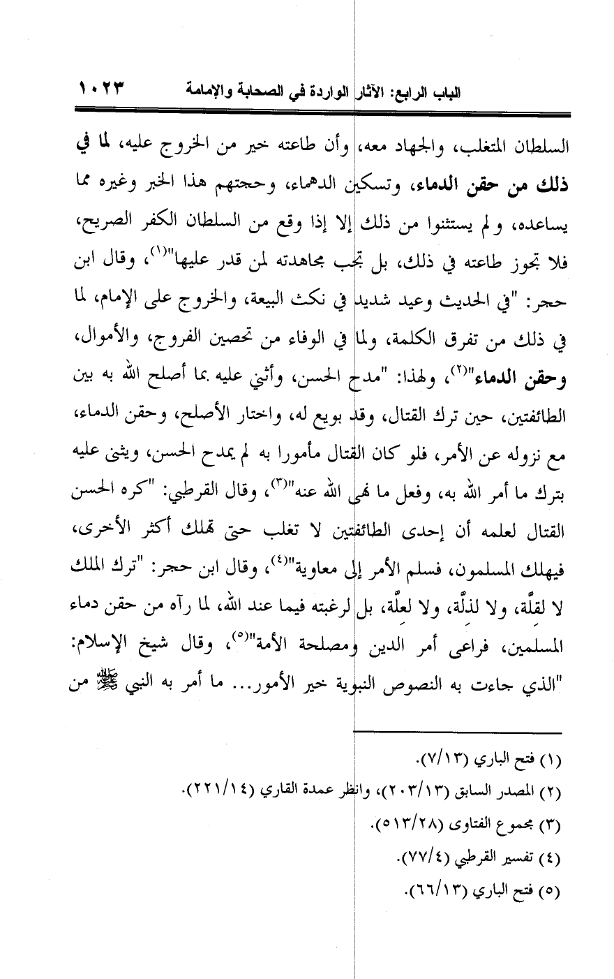 السلطان المتغلب، والجهاد معه، وأن طاعته خير من الخروج عليه، لما في ذلك من حقن الدماء، وتسكين الدهماء، وحجتهم هذا الخبر وغيره مما يساعده، ولم يستثنوا من ذلك إلا إذا وقع من السلطان الكفر الصريح، فلا تجوز طاعته في ذلك، بل تجب مجاهدته لمن قدر عليها" (¬١)، وقال ابن حجر: "في الحديث وعيد شديد في نكث البيعة، والخروج على الإمام، لما في ذلك من تفرق الكلمة، ولما في الوفاء من تحصين الفروج، والأموال، وحقن الدماء" (¬٢)، ولهذا: "مدح الحسن، وأثني عليه بما أصلح اللَّه به بين الطائفتين، حين ترك القتال، وقد بويع له، واختار الأصلح، وحقن الدماء، مع نزوله عن الأمر، فلو كان القتال مأمورا به لم يمدح الحسن، ويثنى عليه بترك ما أمر اللَّه به، وفعل ما نهى اللَّه عنه" (¬٣)، وقال القرطبي: "كره الحسن القتال لعلمه أن إحدى الطائفتين لا تغلب حتى تهلك أكثر الأخرى، فيهلك المسلمون، فسلم الأمر إلى معاوية" (¬٤)، وقال ابن حجر: "ترك الملك لا لقِلَّة، ولا لذِلَّة، ولا لعِلَّة، بل لرغبته فيما عند اللَّه، لما رآه من حقن دماء المسلمين، فراعى أمر الدين ومصلحة الأمة" (¬٥)، وقال شيخ الإسلام: "الذي جاءت به النصوص النبوية خير الأمور. . . ما أمر به النبي -صلى اللَّه عليه وسلم- من