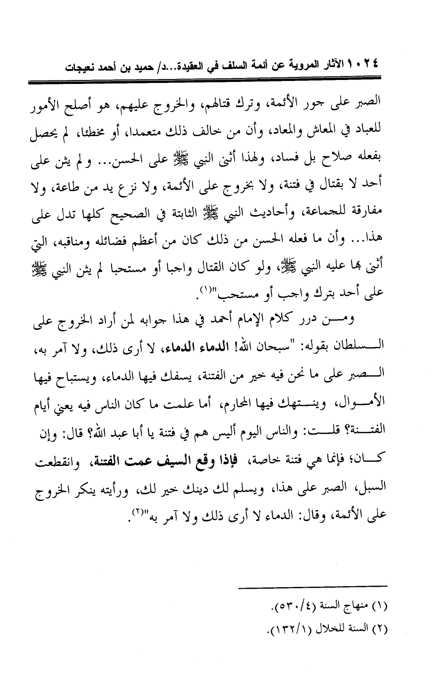 ومن درر كلام الإمام أحمد في هذا جوابه لمن أراد الخروج على السلطان بقوله: "سبحان اللَّه! الدماء الدماء، لا أرى ذلك، ولا آمر به، الصبر على ما نحن فيه خير من الفتنة، يسفك فيها الدماء، ويستباح فيها الأموال، وينتهك فيها المحارم، أما علمت ما كان الناس فيه يعني أيام الفتنة؟ قلت: والناس اليوم أليس هم في فتنة يا أبا عبد اللَّه؟ قال: وإن كان؛ فإنما هي فتنة خاصة، فإذا وقع السيف عمت الفتنة، وانقطعت السبل، الصبر على هذا، ويسلم لك دينك خير لك، ورأيته ينكر الخروج على الأئمة، وقال: الدماء لا أرى ذلك ولا آمر به" (¬٢).