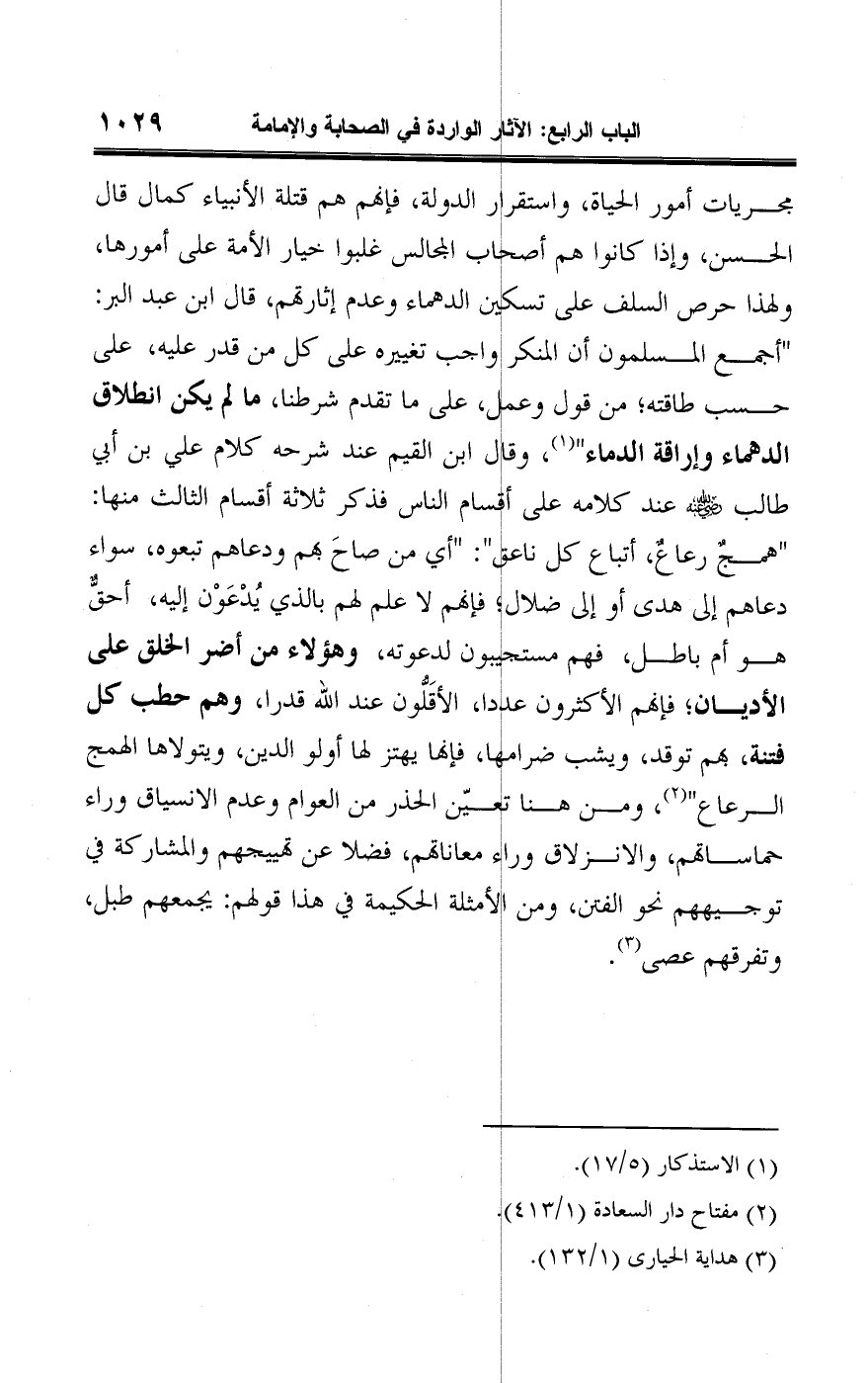 مجريات أمور الحياة، واستقرار الدولة، فإنهم هم قتلة الأنبياء كما قال الحسن، وإذا كانوا هم أصحاب المجالس غلبوا خيار الأمة على أمورها، ولهذا حرص السلف على تسكين الدهماء وعدم إثارتهم، قال ابن عبد البر: "أجمع المسلمون أن المنكر واجب تغييره على كل من قدر عليه، على حسب طاقته؛ من قول وعمل، على ما تقدم شرطنا، ما لم يكن انطلاق الدهماء وإراقة الدماء" (¬١)، وقال ابن القيم عند شرحه كلام علي بن أبي طالب -رضي اللَّه عنه- عند كلامه على أقسام الناس فذكر ثلاثة أقسام الثالث منها: "همجٌ رعاعٌ، أتباع كل ناعق": أي من صاحَ بهم ودعاهم تبعوه، سواء دعاهم إلى هدى أو إلى ضلال؛ فإنهم لا علم لهم بالذي يُدْعَوْن إليه، أحقٌّ هو أم باطل، فهم مستجيبون لدعوته، وهؤلاء من أضر الخلق على الأديان؛ فإنهم الأكثرون عددا، الأقَلُّون عند اللَّه قدرا، وهم حطب كل فتنة، بهم توقد، ويشب ضرامها، فإنها يهتز لها أولو الدين، ويتولاها الهمج الرعاع" (¬٢)، ومن هنا تعيّن الحذر من العوام وعدم الانسياق وراء حماساتهم، والانزلاق وراء معاناتهم، فضلا عن تهييجهم والمشاركة في توجيههم نحو الفتن، ومن الأمثلة الحكيمة في هذا قولهم: يجمعهم طبل، وتفرقهم عصى (¬٣).