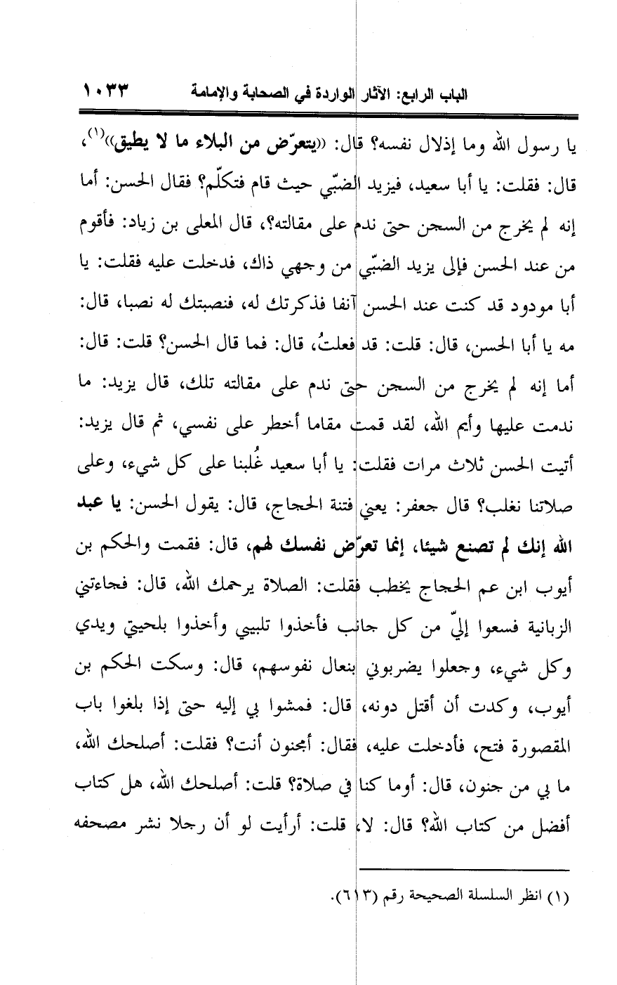 يا رسول اللَّه وما إذلال نفسه؟ قال: "يتعرّض من البلاء ما لا يطيق" (¬١)، قال: فقلت: يا أبا سعيد، فيزيد الضبّي حيث قام فتكلّم؟ فقال الحسن: أما إنه لم يخرج من السجن حتى ندم على مقالته؟ ، قال المعلى بن زياد: فأقوم من عند الحسن فإلى يزيد الضبّي من وجهي ذاك، فدخلت عليه فقلت: يا أبا مودود قد كنت عند الحسن آنفا فذكرتك له، فنصبتك له نصبا، قال: مه يا أبا الحسن، قال: قلت: قد فعلتُ، قال: فما قال الحسن؟ قلت: قال: أما إنه لم يخرج من السجن حتى ندم على مقالته تلك، قال يزيد: ما ندمت عليها وأيم اللَّه، لقد قمت مقاما أخطر على نفسي، ثم قال يزيد: أتيت الحسن ثلاث مرات فقلت: يا أبا سعيد غُلبنا على كل شيء، وعلى صلاتنا نغلب؟ قال جعفر: يعني فتنة الحجاج، قال: يقول الحسن: يا عبد اللَّه إنك لم تصنع شيئا، إنما تعرّض نفسك لهم، قال: فقمت والحكم بن أيوب ابن عم الحجاج يخطب فقلت: الصلاة يرحمك اللَّه، قال: فجاءتني الزبانية فسعوا إليّ من كل جاليب فأخذوا تلبيي وأخذوا بلحيتي ويدي وكل شيء، وجعلوا يضربوني بنعال نفوسهم، قال: وسكت الحكم بن أيوب، وكدت أن أقتل دونه، قال: فمشوا بي إليه حتى إذا بلغوا باب المقصورة فتح، فأدخلت عليه، فقال: أمجنون أنت؟ فقلت: أصلحك اللَّه، ما بي من جنون، قال: أو ما كنا في صلاة؟ قلت: أصلحك اللَّه، هل كتاب أفضل من كتاب اللَّه؟ قال: لا، قلت: أرأيت لو أن رجلا نشر مصحفه