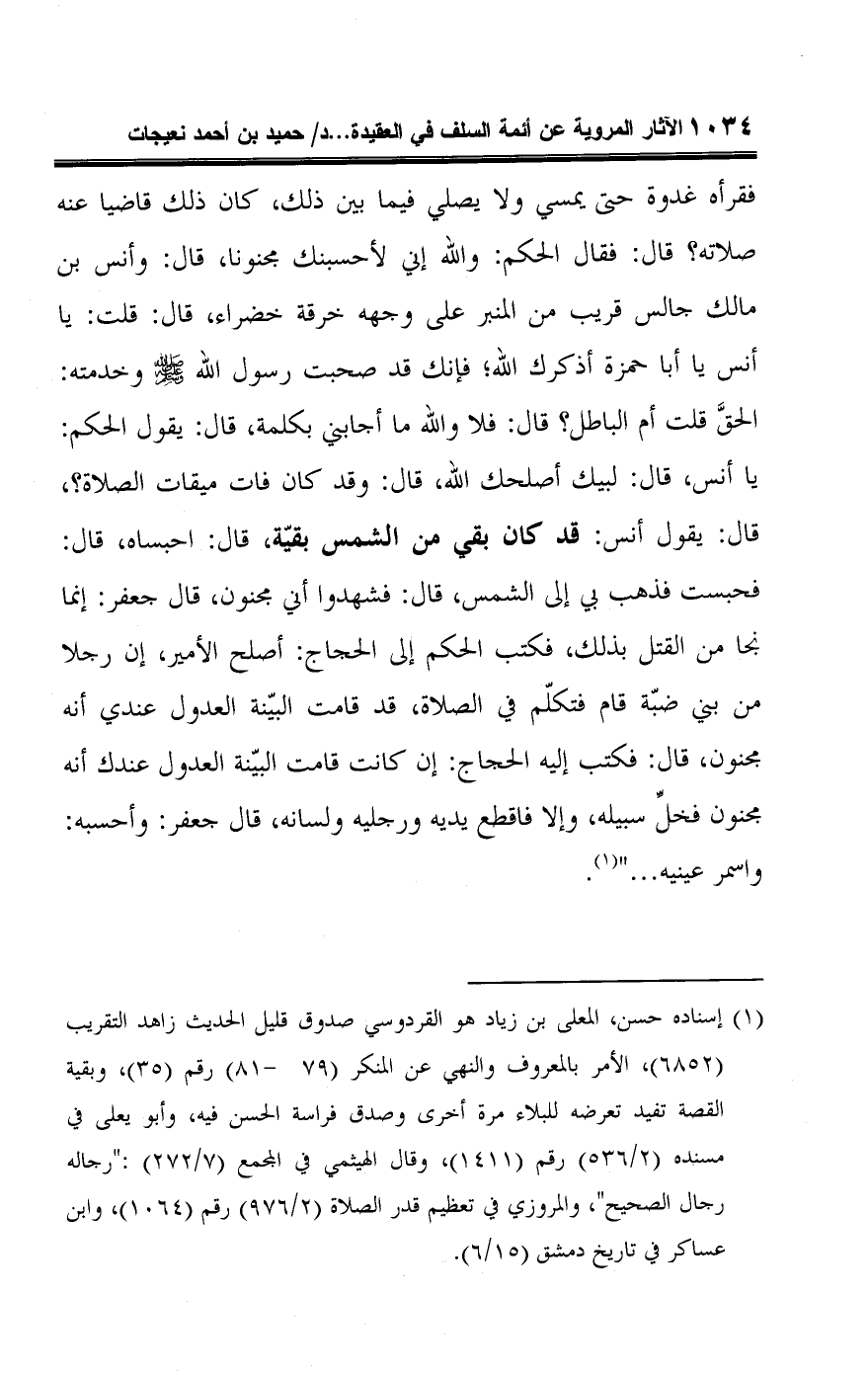 فقرأه غدوة حتى يمسي ولا يصلي فيما بين ذلك، كان ذلك قاضيا عنه صلاته؟ قال: فقال الحكم: واللَّه إني لأحسبنك مجنونا، قال: وأنس بن مالك جالس قريب من المنبر على وجهه خرقة خضراء، قال: قلت: يا أنس يا أبا حمزة أذكرك اللَّه؛ فإنك قد صحبت رسول اللَّه -صلى اللَّه عليه وسلم- وخدمته: الحقَّ قلت أم الباطل؟ قال: فلا واللَّه ما أجابني بكلمة، قال: يقول الحكم: يا أنس، قال: لبيك أصلحك اللَّه، قال: وقد كان فات ميقات الصلاة؟ ، قال: يقول أنس: قد كان بقي من الشمس بقيّة، قال: احبساه، قال: فحبست فذهب بي إلى الشمس، قال: فشهدوا أني مجنون، قال جعفر: إنما نجا من القتل بذلك، فكتب الحكم إلى الحجاج: أصلح الأمير، إن رجلا من بني ضبّة قام فتكلّم في الصلاة، قد قامت البيّنة العدول عندي أنه مجنون، قال: فكتب إليه الحجاج: إن كانت قامت البيّنة العدول عندك أنه مجنون فخلِّ سبيله، وإلا فاقطع يديه ورجليه ولسانه، قال جعفر: وأحسبه: واسمر عينيه. . . " (¬١).