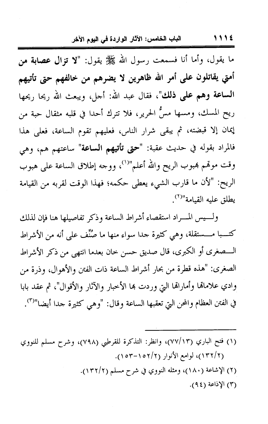 وليس المراد استقصاء أشراط الساعة وذكر تفاصيلها هنا فإن لذلك كتبا مستقلة، وهي كثيرة جدا سواء منها ما صُنِّف على أنه من الأشراط الصغرى أو الكبرى، قال صديق حسن خان بعدما انتهى من ذكر الأشراط الصغرى: "هذه قطرة من بحار أشراط الساعة ذات الفتن والأهوال، وذرة من وادي علاماتها وأماراتها التي وردت بها الأخبار والآثار والأقوال"، ثم عقد بابا في الفتن العظام والمحن التي تعقبها الساعة وقال: "وهي كثيرة جدا أيضًا" (¬٣).