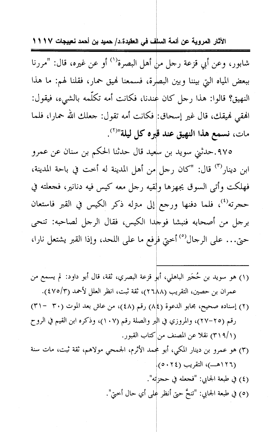 ٩٧٥ - حدثني سويد بن سعيد قال حدثنا الحكم بن سنان عن عمرو ابن دينار (¬٣) قال: "كان رجل من أهل المدينة له أخت في باحة المدينة، فهلكت وأتى السوق يجهزها ولقيه رجل معه كيس فيه دنانير، فجعلته في حجرته (¬٤)، فلما دفنها ورجع إلى منزله ذكر الكيس في القبر فاستعان برجل من أصحابه فنبشا فوجدا الكيس، فقال الرجل لصاحبه: تنحى حتى. . . على الرجال (¬٥) أختي فرفع ما على اللحد، وإذا القبر يشتعل نارا،