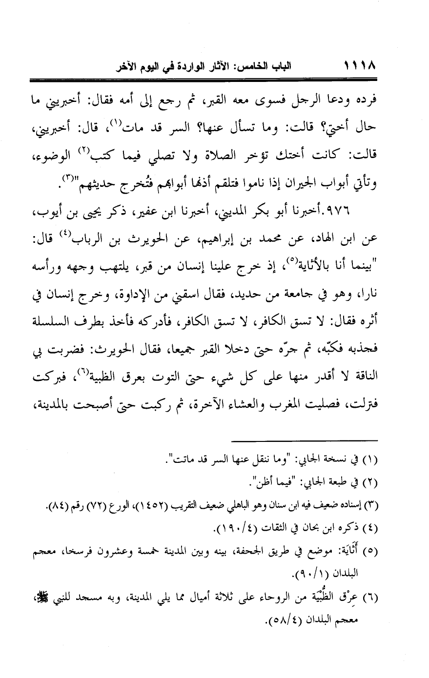٩٧٦ - أخبرنا أبو بكر المديني، أخبرنا ابن عفير، ذكر يحيى بن أيوب، عن ابن الهاد، عن محمد بن إبراهيم، عن الحويرث بن الرباب (¬٤) قال: "بينما أنا بالأثاية (¬٥)، إذ خرج علينا إنسان من قبر، يلتهب وجهه ورأسه نارا، وهو في جامعة من حديد، فقال اسقني من الإداوة، وخرج إنسان في أثره فقال: لا تسق الكافر، لا تسق الكافر، فأدركه فأخذ بطرف السلسلة فجذبه فكبّه، ثم جرّه حتى دخلا القبر جميعا، فقال الحويرث: فضربت بي الناقة لا أقدر منها على كل شيء حتى التوت بعرق الظبية (¬٦)، فبركت فنزلت، فصليت المغرب والعشاء الآخرة، ثم ركبت حتى أصبحت بالمدينة،