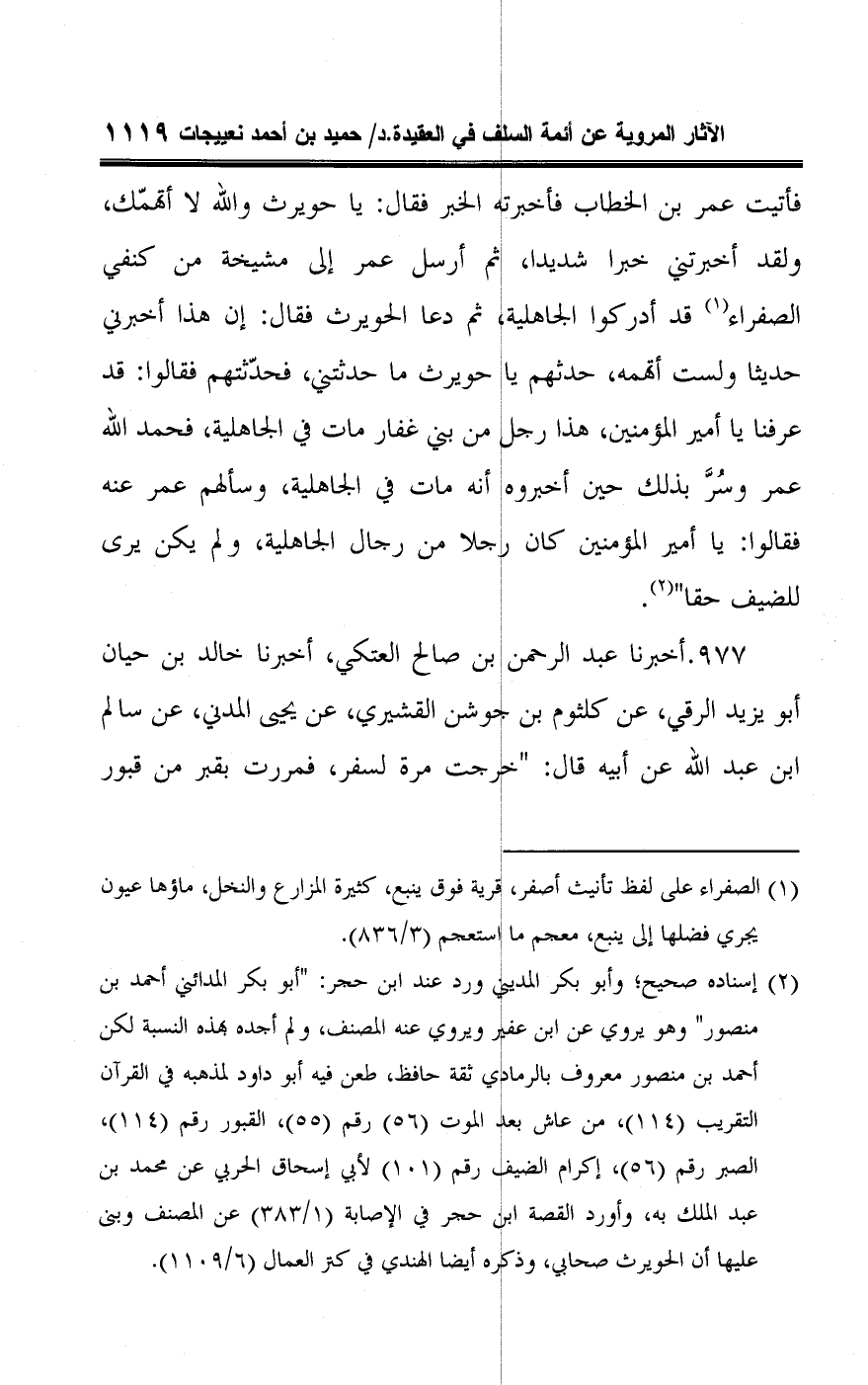 فأتيت عمر بن الخطاب فأخبرته الخبر فقال: يا حويرث واللَّه لا أتهمّك، ولقد أخبرتني خبرا شديدا، ثم أرسل عمر إلى مشيخة من كنفي الصفراء (¬١) قد أدركوا الجاهلية، ثم دعا الحويرث فقال: إن هذا أخبرني حديثا ولست أتهمه، حدثهم يا حويرث ما حدثتني، فحدّثتهم فقالوا: قد عرفنا يا أمير المؤمنين، هذا رجل من بني غفار مات في الجاهلية، فحمد اللَّه عمر وسُرَّ بذلك حين أخبروه أنه مات في الجاهلية، وسألهم عمر عنه فقالوا: يا أمير المؤمنين كان رجلا من رجال الجاهلية، ولم يكن يرى للضيف حقا" (¬٢).