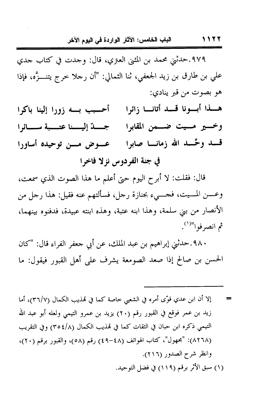 ٩٧٩ - حدثني محمد بن المثنى العنزي، قال: وجدت في كتاب جدي علي بن طارق بن زيد الجعفي، ثنا الثمالي: "أن رجلا خرج يتنزَّه، فإذا هو بصوت من قبر ينادي: