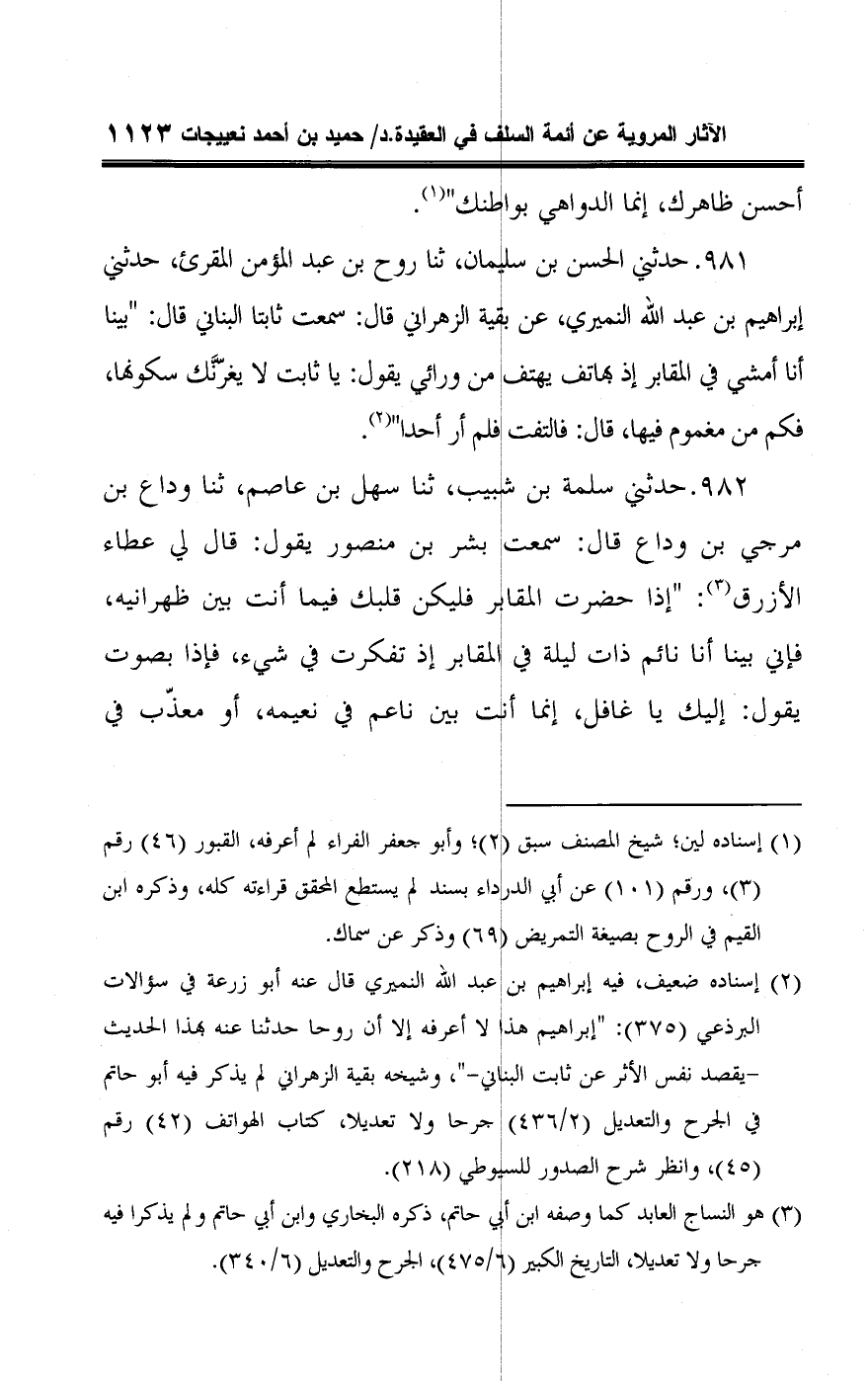 (¬٢) إسناده ضعيف، فيه إبراهيم بن عبد اللَّه النميري قال عنه أبو زرعة في سؤالات البرذعي (٣٧٥): "إبراهيم هذا لا أعرفه إلا أن روحا حدثنا عنه بهذا الحديث -يقصد نفس الأثر عن ثابت البناني-"، وشيخه بقية الزهراني لم يذكر فيه أبو حاتم في الجرح والتعديل (٢/ ٤٣٦) جرحا ولا تعديلا، كتاب الهواتف (٤٢) رقم (٤٥)، وانظر شرح الصدور للسيوطي (٢١٨).