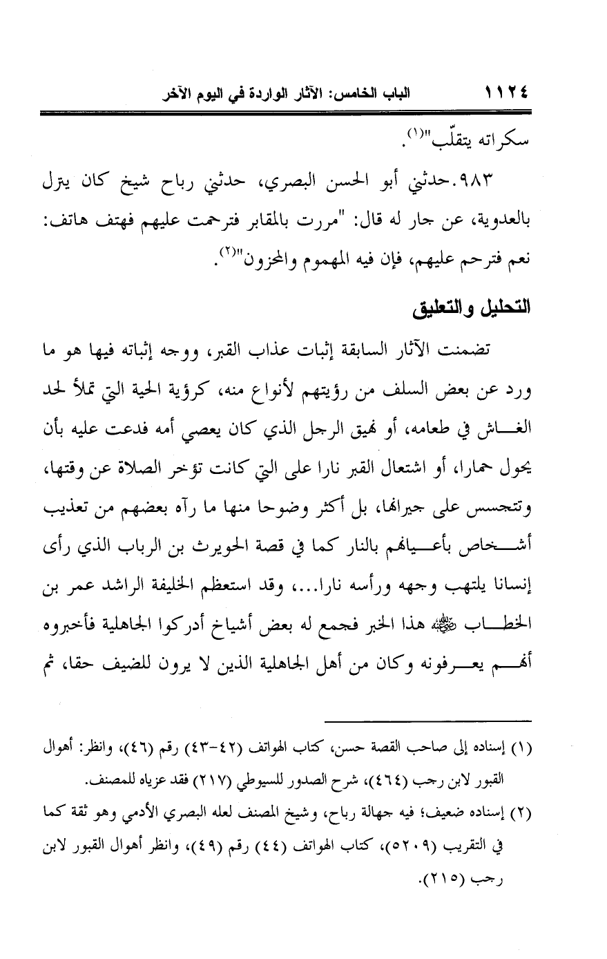 ٩٨٣ - حدثني أبو الحسن البصري، حدثني رباح شيخ كان ينزل بالعدوية، عن جار له قال: "مررت بالمقابر فتركت عليهم فهتف هاتف: نعم فترحم عليهم، فإن فيه المهموم والمحزون" (¬٢).