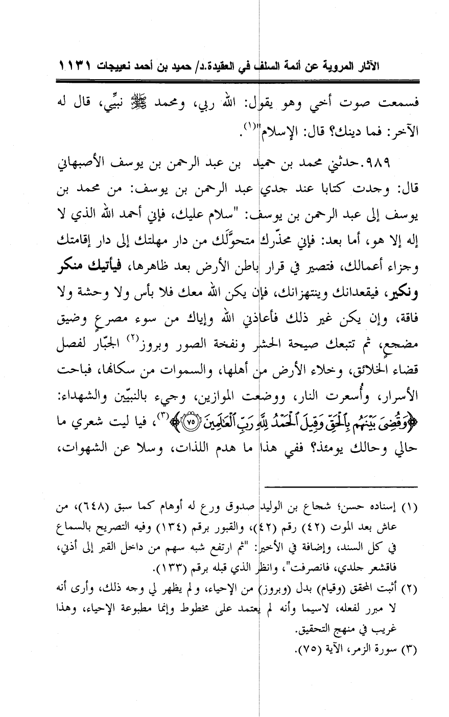 ٩٨٩ - حدثني محمد بن حميد بن عبد الرحمن بن يوسف الأصبهاني قال: وجدت كتابا عند جدي عبد الرحمن بن يوسف: من محمد بن يوسف إلى عبد الرحمن بن يوسف: "سلام عليك، فإني أحمد اللَّه الذي لا إله إلا هو، أما بعد: فإني محذّرك متحوَّلَك من دار مهلتك إلى دار إقامتك وجزاء أعمالك، فتصير في قرار باطن الأرض بعد ظاهرها، فيأتيك منكر ونكير، فيقعدانك وينتهزانك، فإن يكن اللَّه معك فلا بأس ولا وحشة ولا فاقة، وإن يكن غير ذلك فأعاذني اللَّه وإياك من سوء مصرعٍ وضيق مضجعٍ، ثم تتبعك صيحة الحشر ونفخة الصور وبروز (¬٢) الجبّار لفصل قضاء الخلائق، وخلاء الأرض من أهلها، والسموات من سكانها، فباحت الأسرار، وأُسعرت النار، ووضعت الموازين، وجيء بالنبيّين والشهداء: {وَقُضِيَ بَيْنَهُمْ بِالْحَقِّ وَقِيلَ الْحَمْدُ لِلَّهِ رَبِّ الْعَالَمِينَ (٧٥)} (¬٣)، فيا ليت شعري ما حالي وحالك يومئذ؟ ففي هذا ما هدم اللذات، وسلا عن الشهوات،