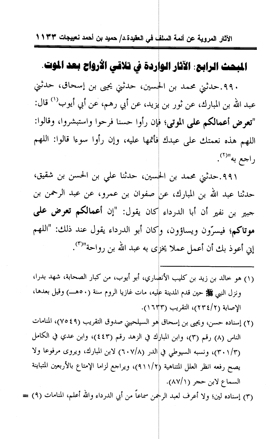 ٩٩١ - حدثني محمد بن الحسين، حدثنا علي بن الحسن بن شقيق، حدثنا عبد اللَّه بن المبارك، عن صفوان بن عمرو، عن عبد الرحمن بن جبير بن نفير أن أبا الدرداء كان يقول: "إن أعمالكم تعرض على موتاكم؛ فيسرّون ويساؤون، وكان أبو الدرداء يقول عند ذلك: "اللهم إني أعوذ بك أن أعمل عملا يخزى به عبد اللَّه بن رواحة" (¬٣).