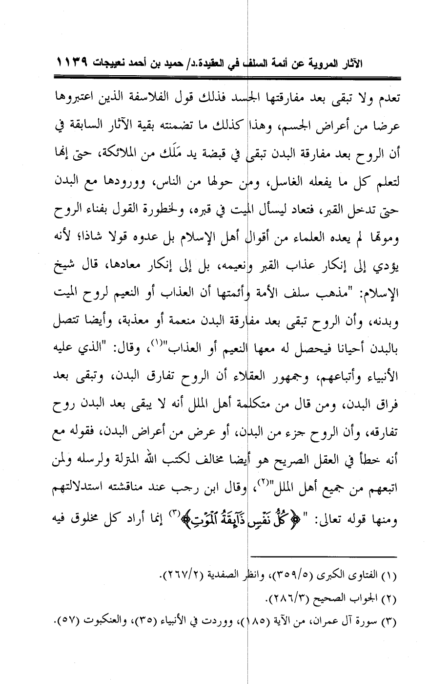 تعدم ولا تبقى بعد مفارقتها الجسد فذلك قول الفلاسفة الذين اعتبروها عرضا من أعراض الجسم، وهذا كذلك ما تضمنته بقية الآثار السابقة في أن الروح بعد مفارقة البدن تبقى في قبضة يد مَلَك من الملائكة، حتى إنها لتعلم كل ما يفعله الغاسل، ومن حولها من الناس، وورودها مع البدن حتى تدخل القبر، فتعاد ليسأل الميت في قبره، ولخطورة القول بفناء الروح وموتها لم يعده العلماء من أقوال أهل الإسلام بل عدوه قولا شاذا؛ لأنه يؤدي إلى إنكار عذاب القبر ونعيمه، بل إلى إنكار معادها، قال شيخ الإسلام: "مذهب سلف الأمة وأئمتها أن العذاب أو النعيم لروح الميت وبدنه، وأن الروح تبقى بعد مفارقة البدن منعمة أو معذبة، وأيضا تتصل بالبدن أحيانا فيحصل له معها النعيم أو العذاب" (¬١) وقال: "الذي عليه الأنبياء وأتباعهم، وجمهور العقلاء أن الروح تفارق البدن، وتبقى بعد فراق البدن، ومن قال من متكلمة أهل الملل أنه لا يبقى بعد البدن روح تفارقه، وأن الروح جزء من البدن، أو عرض من أعراض البدن، فقوله مع أنه خطأ في العقل الصريح هو أيضًا مخالف لكتب اللَّه المنزلة ولرسله ولمن اتبعهم من جميع أهل الملل" (¬٢) وقال ابن رجب عند مناقشته استدلالتهم ومنها قوله تعالى: " {كُلُّ نَفْسٍ ذَائِقَةُ الْمَوْتِ} (¬٣) إنما أراد كل مخلوق فيه