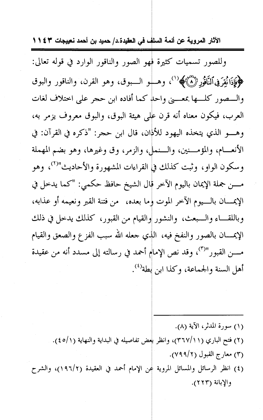 وللصور تسميات كثيرة هو الصور والناقور الوارد في قوله تعالى: {فَإِذَا نُقِرَ فِي النَّاقُورِ (٨)} (¬١)، وهو البوق، وهو القرن، والناقور والبوق والصور كلها بمعنى واحد كما أفاده ابن حجر على اختلاف لغات العرب، فيكون معناه أنه قرن على هيئة البوق، والبوق معروف يزمر به، وهو الذي يتخذه اليهود للأذان، قال ابن حجر: "ذكره في القرآن: في الأنعام، والمؤمنين، والنمل، والزمر، وق وغيرها، وهو بضم المهملة وسكون الواو، وثبت كذلك في القراءات المشهورة والأحاديث" (¬٢)، وهو من جملة الإيمان باليوم الآخر قال الشيخ حافظ حكمي: "كما يدخل في الإيمان باليوم الآخر الموت وما بعده، من فتنة القبر ونعيمه أو عذابه، وباللقاء والبعث، والنشور والقيام من القبور، كذلك يدخل في ذلك الإيمان بالصور والنفخ فيه، الذي جعله اللَّه سبب الفزع والصعق والقيام من القبور" (¬٣)، وقد نص الإمام أحمد في رسالته إلى مسدد أنه من عقيدة أهل السنة والجماعة، وكذا ابن بطة (¬٤).