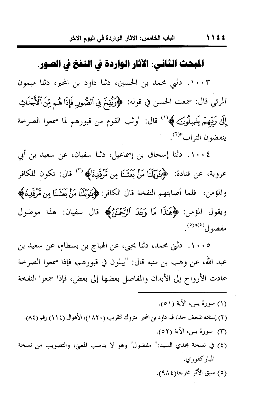 ١٠٠٥ - دثني محمد، دثنا يحيى، عن الهياج بن بسطام، عن سعيد بن عبد اللَّه، عن وهب بن منبه قال: "يبلون في قبورهم، فإذا سمعوا الصرخة عادت الأرواح إلى الأبدان والمفاصل بعضها إلى بعض، فإذا سمعوا النفخة