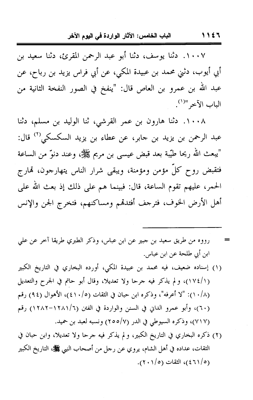 ١٠٠٧ - دثنا يوسف، دثنا أبو عبد الرحمن المقرئ، دثنا سعيد بن أبي أيوب، دثني محمد بن عبيدة المكي، عن أبي فراس يزيد بن رباح، عن عبد اللَّه بن عمرو بن العاص قال: "ينفخ في الصور النفخة الثانية من الباب الآخر" (¬١).