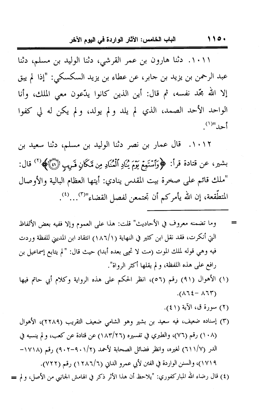 ١٠١١ - دثنا هارون بن عمر القرشي، دثنا الوليد بن مسلم، دثنا عبد الرحمن بن يزيد بن جابر، عن عطاء بن يزيد السكسكي: "إذا لم يبق إلا اللَّه مجّد نفسه، ثم قال: أين الذين كانوا يدّعون معي الملك، وأنا الواحد الأحد الصمد، الذي لم يلد ولم يولد، ولم يكن له لي كفوا أحد" (¬١).