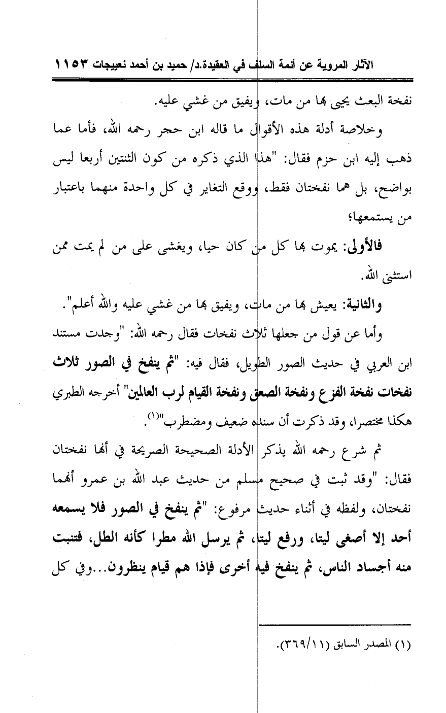 وأما عن قول من جعلها ثلاث نفخات فقال رحمه اللَّه: "وجدت مستند ابن العربي في حديث الصور الطويل، فقال فيه: "ثم ينفخ في الصور ثلاث نفخات نفخة الفزع ونفخة الصعق ونفخة القيام لرب العالمين" أخرجه الطبري هكذا مختصرا، وقد ذكرت أن سنده ضعيف ومضطرب" (¬١).