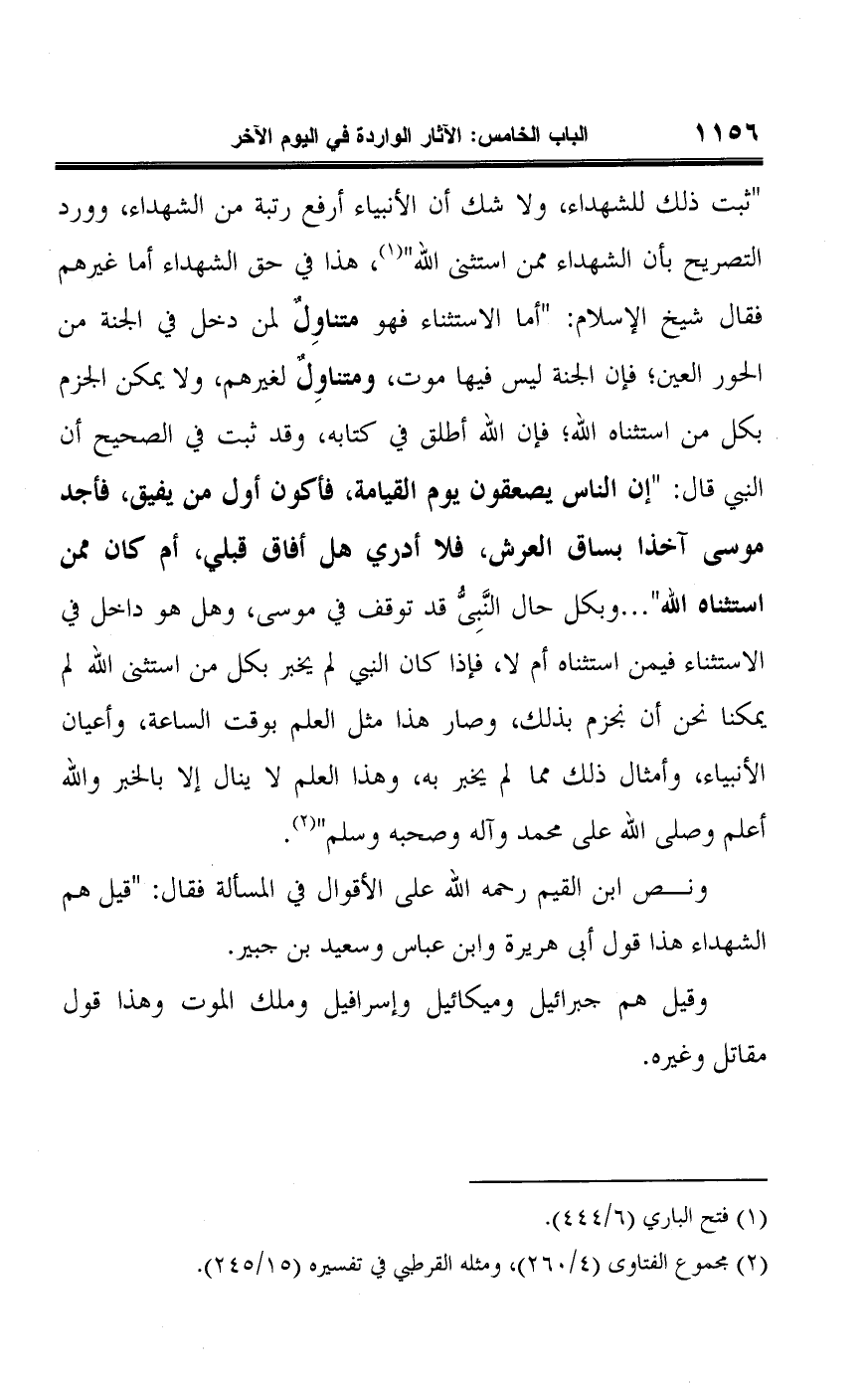 "ثبت ذلك للشهداء، ولا شك أن الأنبياء أرفع رتبة من الشهداء، وورد التصريح بأن الشهداء ممن استثنى اللَّه" (¬١)، هذا في حق الشهداء أما غيرهم فقال شيخ الإسلام: "أما الاستثناء فهو متناوِلٌ لمن دخل في الجنة من الحور العين، فإن الجنة ليس فيها موت، ومتناوِلٌ لغيرهم، ولا يمكن الجزم بكل من استثناه اللَّه؛ فإن اللَّه أطلق في كتابه، وقد ثبت في الصحيح أن النبي قال: "إن الناس يصعقون يوم القيامة، فأكون أول من يفيق، فأجد موسى آخذا بساق العرش، فلا أدري هل أفاق قبلي، أم كان ممن استثناه اللَّه". . . وبكل حال النَّبِيُّ قد توقف في موسى، وهل هو داخل في الاستثناء فيمن استثناه أم لا، فإذا كان النبي لم يخبر بكل من استثنى اللَّه لم يمكنا نحن أن نجزم بذلك، وصار هذا مثل العلم بوقت الساعة، وأعيان الأنبياء، وأمثال ذلك مما لم يخبر به، وهذا العلم لا ينال إلا بالخبر واللَّه أعلم وصلى اللَّه على محمد وآله وصحبه وسلم" (¬٢).