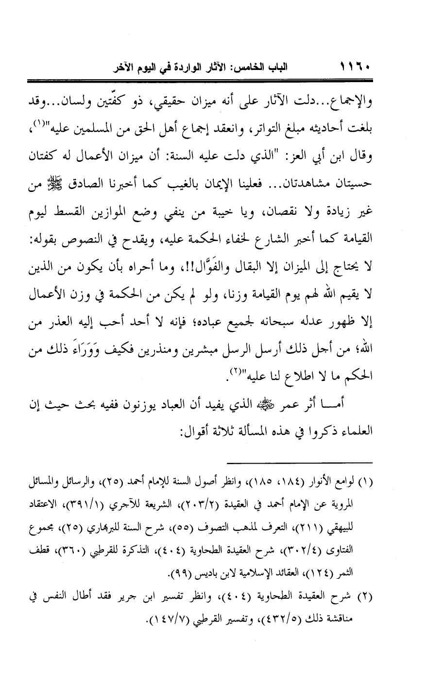 أما أثر عمر -رضي اللَّه عنه- الذي يفيد أن العباد يوزنون ففيه بحث حيث إن العلماء ذكروا في هذه المسألة ثلاثة أقوال: