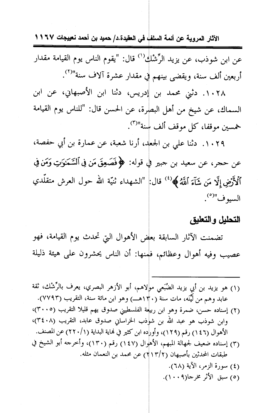 ١٠٢٩ - دثنا علي بن الجعد، أرنا شعبة، عن عمارة بن أبي حفصة، عن حجر، عن سعيد بن جبير في قوله: {فَصَعِقَ مَنْ فِي السَّمَاوَاتِ وَمَنْ فِي الْأَرْضِ إِلَّا مَنْ شَاءَ اللَّهُ} (¬٤) قال: "الشهداء ثنيّة اللَّه حول العرش متقلّدي السيوف" (¬٥).
