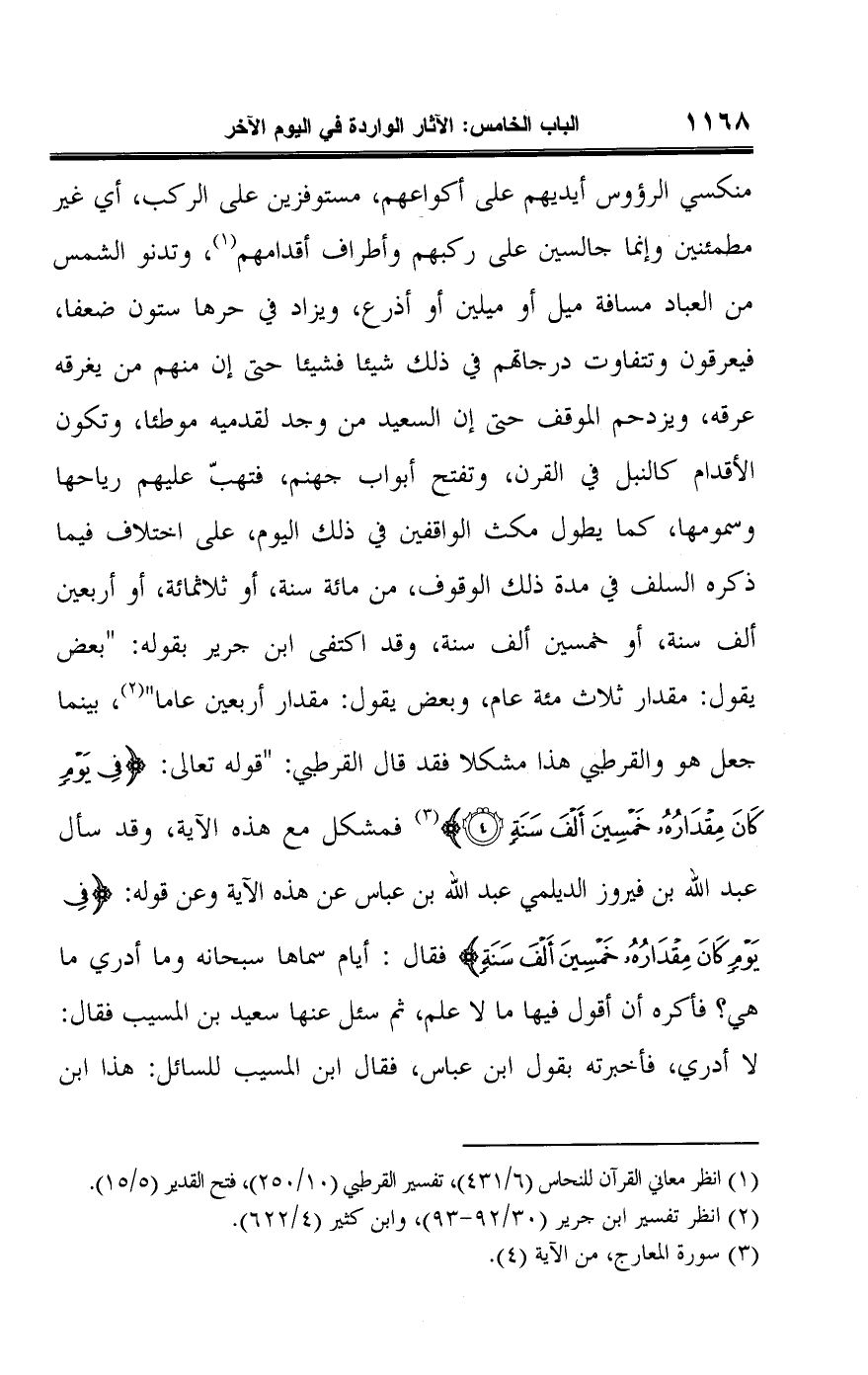 منكسي الرؤوس أيديهم على أكواعهم، مستوفزين على الركب؛ أي غير مطمئنين وإنما جالسين على ركبهم وأطراف أقدامهم (¬١)، وتدنو الشمس من العباد مسافة ميل أو ميلين أو أذرع، ويزاد في حرها ستون ضعفا، فيعرقون وتتفاوت درجاتهم في ذلك شيئًا فشيئا حتى إن منهم من يغرقه عرقه، ويزدحم الموقف حتى إن السعيد من وجد لقدميه موطئا، وتكون الأقدام كالنبل في القرن، وتفتح أبواب جهنم، فتهبّ عليهم رياحها وسمومها، كما يطول مكث الواقفين في ذلك اليوم، على اختلاف فيما ذكره السلف في مدة ذلك الوقوف، من مائة سنة، أو ثلاثمائة، أو أربعين ألف سنة، أو خمسين ألف سنة، وقد اكتفى ابن جرير بقوله: "بعض يقول: مقدار ثلاث مئة عام، وبعض يقول: مقدار أربعين عاما" (¬٢)، بينما جعل هو والقرطبي هذا مشكلا فقد قال القرطبي: "قوله تعالى: {فِي يَوْمٍ كَانَ مِقْدَارُهُ خَمْسِينَ أَلْفَ سَنَةٍ (٤)} (¬٣) فمشكل مع هذه الآية، وقد سأل عبد اللَّه بن فيروز الديلمي عبد اللَّه بن عباس عن هذه الآية وعن قوله: {فِي يَوْمٍ كَانَ مِقْدَارُهُ خَمْسِينَ أَلْفَ سَنَةٍ (٤)} فقال: أيام سماها سبحانه وما أدري ما هي؟ فأكره أن أقول فيها ما لا علم، ثم سئل عنها سعيد بن المسيب فقال: لا أدري، فأخبرته بقول ابن عباس، فقال ابن المسيب للسائل: هذا ابن