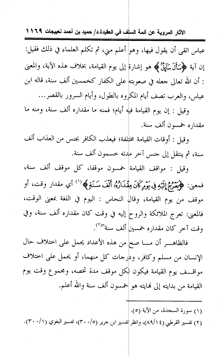 وقيل: مواقف القيامة خمسون موقفا، كل موقف ألف سنة، فمعنى: {ثُمَّ يَعْرُجُ إِلَيْهِ فِي يَوْمٍ كَانَ مِقْدَارُهُ أَلْفَ سَنَةٍ} (¬١) أي مقدار وقت، أو موقف من يوم القيامة وقال النحاس: اليوم في اللغة بمعنى الوقت، فالمعنى: تعرج الملائكة والروح إليه في وقت كان مقداره ألف سنة، وفي وقت آخر كان مقداره خمسين ألف سنة" (¬٢).
