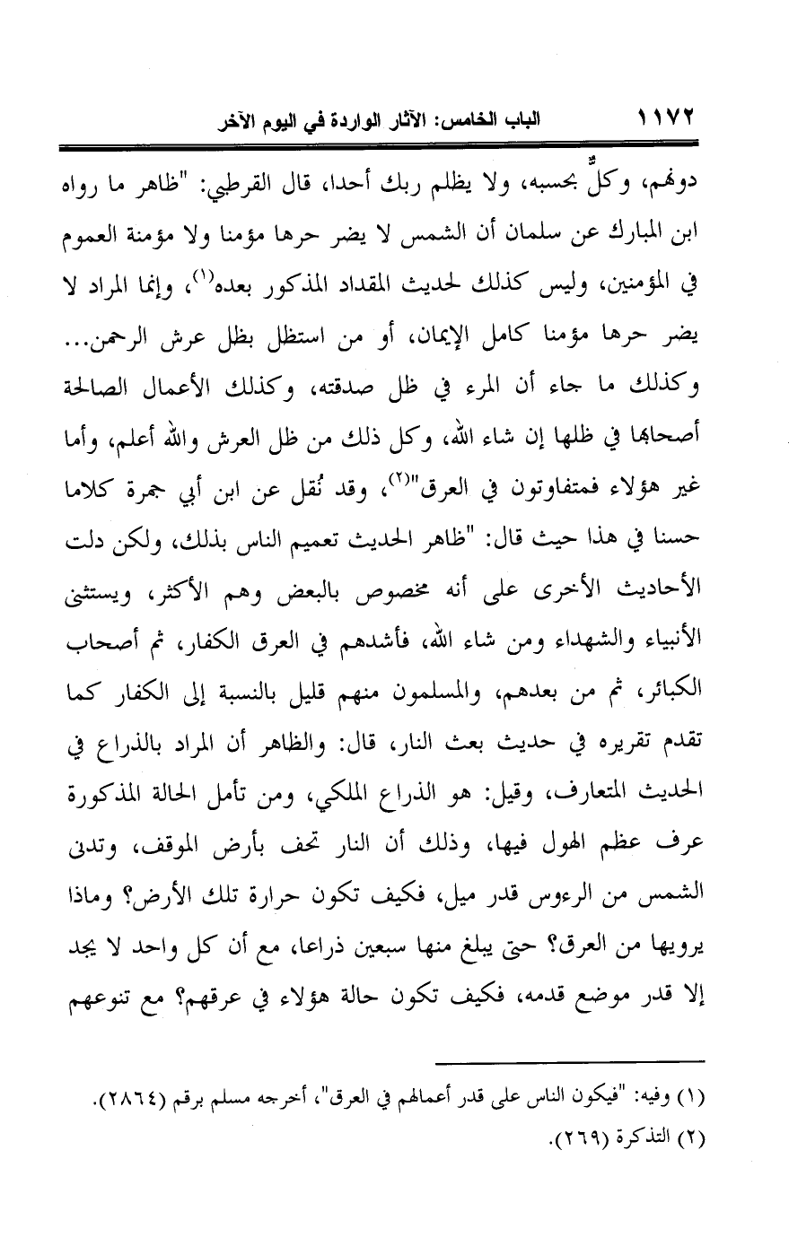 دونهم، وكلٌّ بحسبه، ولا يظلم ربك أحدا، قال القرطبي: "ظاهر ما رواه ابن المبارك عن سلمان أن الشمس لا يضر حرها مؤمنا ولا مؤمنة العموم في المؤمنين، وليس كذلك لحديث المقداد المذكور بعده (¬١)، وإنما المراد لا يضر حرها مؤمنا كامل الإيمان، أو من استظل بظل عرش الرحمن. . . وكذلك ما جاء أن المرء في ظل صدقته، وكذلك الأعمال الصالحة أصحابها في ظلها إن شاء اللَّه، وكل ذلك من ظل العرش واللَّه أعلم، وأما غير هؤلاء فمتفاوتون في العرق" (¬٢)، وقد نُقل عن ابن أبي حمرة كلاما حسنا في هذا حيث قال: "ظاهر الحديث تعميم الناس بذلك، ولكن دلت الأحاديث الأخرى على أنه مخصوص بالبعض وهم الأكثر، ويستثنى الأنبياء والشهداء ومن شاء اللَّه، فأشدهم في العرق الكفار، ثم أصحاب الكبائر، ثم من بعدهم، والمسلمون منهم قليل بالنسبة إلى الكفار كما تقدم تقريره في حديث بعث النار، قال: والظاهر أن المراد بالذراع في الحديث المتعارف، وقيل: هو الذراع الملكي، ومن تأمل الحالة المذكورة عرف عظم الهول فيها، وذلك أن النار تحف بأرض الموقف، وتدنى الشمس من الرءوس قدر ميل، فكيف تكون حرارة تلك الأرض؟ وماذا يرويها من العرق؟ حتى يبلغ منها سبعين ذراعا، مع أن كل واحد لا يجد إلا قدر موضع قدمه، فكيف تكون حالة هؤلاء في عرقهم؟ مع تنوعهم
