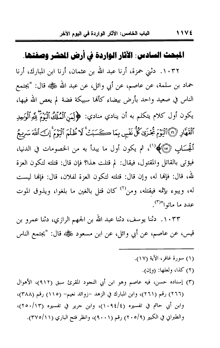 ١٠٣٢ - دثني حمزة، أرنا عبد اللَّه بن عثمان، أرنا ابن المبارك، أرنا حماد بن سلمة، عن عاصم، عن أبي وائل، عن عبد اللَّه -رضي اللَّه عنه- قال: "يجتمع الناس في صعيد واحد بأرض بيضاء كأنها سبيكة فضة لم يعص اللَّه فيها، يكون أول كلام يتكلم به أن ينادي منادي: {لِمَنِ الْمُلْكُ الْيَوْمَ لِلَّهِ الْوَاحِدِ الْقَهَّارِ (١٦) الْيَوْمَ تُجْزَى كُلُّ نَفْسٍ بِمَا كَسَبَتْ لَا ظُلْمَ الْيَوْمَ إِنَّ اللَّهَ سَرِيعُ الْحِسَابِ (١٧)} (¬١)، ثم يكون أول ما يبدأ به من الخصومات في الدنيا، فيؤتى بالقاتل والمقتول، فيقال: لم قتلت هذا؟ فإن قال: قتلته لتكون العزة للَّه، قال: فإنها له، وإن قال: قتلته لتكون العزة لفلان، قال: فإنها ليست له، ويبوء بإثمه فيقتله، ومن (¬٢) كان قتل بالغين ما بلغوا، ويذوق الموت عدد ما ماتوا" (¬٣).
