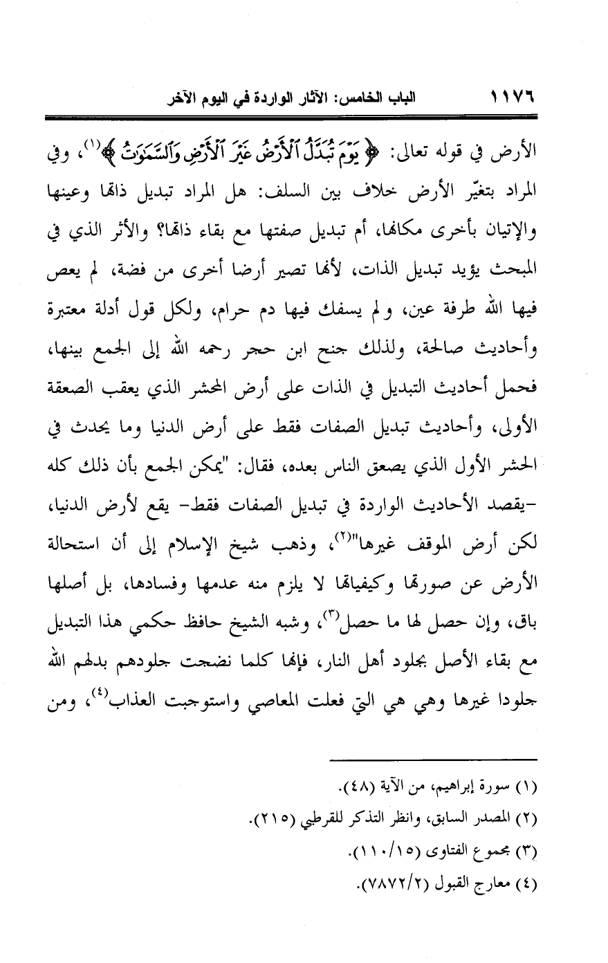 الأرض في قوله تعالى: {يَوْمَ تُبَدَّلُ الْأَرْضُ غَيْرَ الْأَرْضِ وَالسَّمَاوَاتُ} (¬١)، وفي المراد بتغيّر الأرض خلاف بين السلف: هل المراد تبديل ذاتها وعينها والإتيان بأخرى مكانها، أم تبديل صفتها مع بقاء ذاتها؟ والأثر الذي في المبحث يؤيد تبديل الذات؛ لأنها تصير أرضا أخرى من فضة، لم يعص فيها اللَّه طرفة عين، ولم يسفك فيها دم حرام، ولكل قول أدلة معتبرة وأحاديث صالحة، ولذلك جنح ابن حجر رحمه اللَّه إلى الجمع بينها، فحمل أحاديث التبديل في الذات على أرض المحشر الذي يعقب الصعقة الأولى، وأحاديث تبديل الصفات فقط على أرض الدنيا وما يحدث في الحشر الأول الذي يصعق الناس بعده، فقال: "يمكن الجمع بأن ذلك كله -يقصد الأحاديث الواردة في تبديل الصفات فقط- يقع لأرض الدنيا، لكن أرض الموقف غيرها" (¬٢)، وذهب شيخ الإسلام إلى أن استحالة الأرض عن صورتها وكيفياتها لا يلزم منه عدمها وفسادها، بل أصلها باق، وإن حصل لها ما حصل (¬٣)، وشبه الشيخ حافظ حكمي هذا التبديل مع بقاء الأصل بجلود أهل النار، فإنها كلما نضجت جلودهم بدلهم اللَّه جلودا غيرها وهي هي التي فعلت المعاصي واستوجبت العذاب (¬٤)، ومن