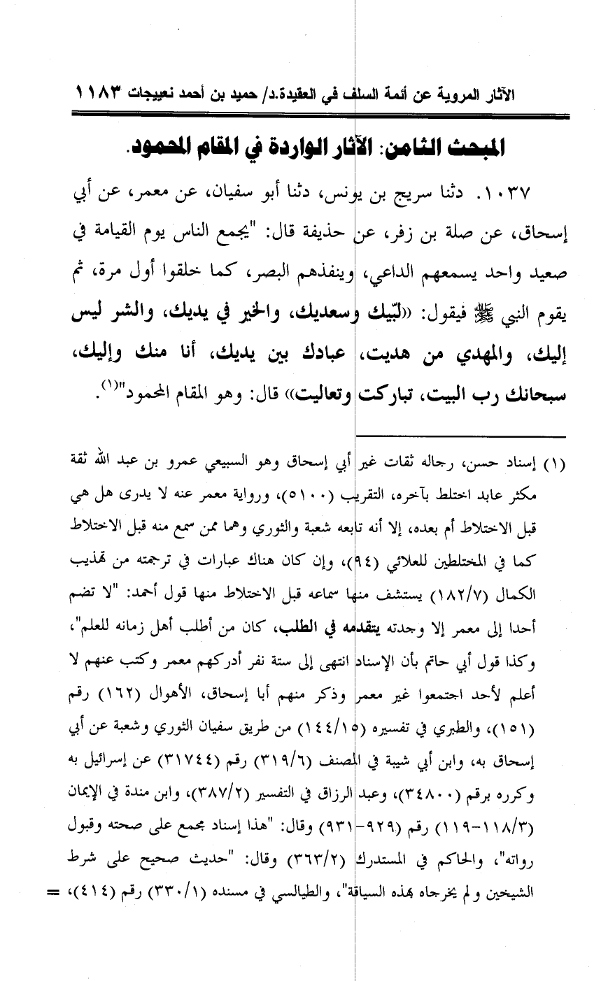 ١٠٣٧ - دثنا سريج بن يونس، دثنا أبو سفيان، عن معمر، عن أبي إسحاق، عن صلة بن زفر، عن حذيفة قال: "يجمع الناس يوم القيامة في صعيد واحد يسمعهم الداعي، وينفذهم البصر، كما خلقوا أول مرة، ثم يقوم النبي -صلى اللَّه عليه وسلم- فيقول: "لبّيك وسعديك، والخير في يديك، والشر ليس إليك، والمهدي من هديت، عبادك بين يديك، أنا منك وإليك، سبحانك رب البيت، تباركت وتعاليت" قال: وهو المقام المحمود" (¬١).