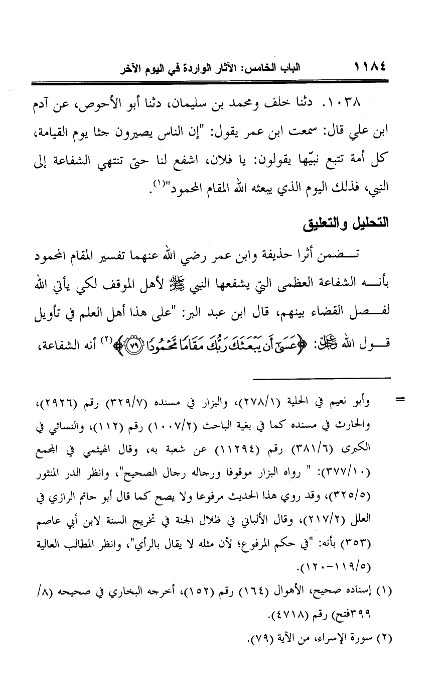 ١٠٣٨ - دثنا خلف ومحمد بن سليمان، دثنا أبو الأحوص، عن آدم ابن علي قال: سمعت ابن عمر يقول: "إن الناس يصيرون جثا يوم القيامة، كل أمة تتبع نبيّها يقولون: يا فلان، اشفع لنا حتى تنتهي الشفاعة إلى النبي، فذلك اليوم الذي يبعثه اللَّه المقام المحمود" (¬١).